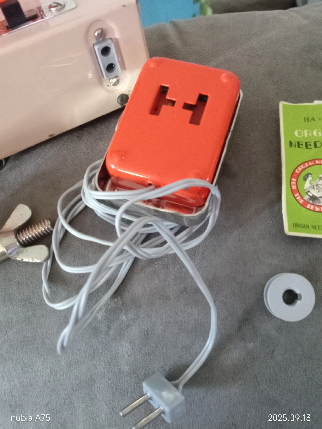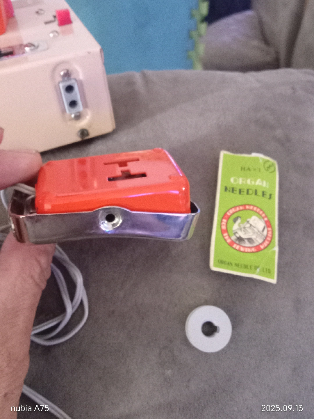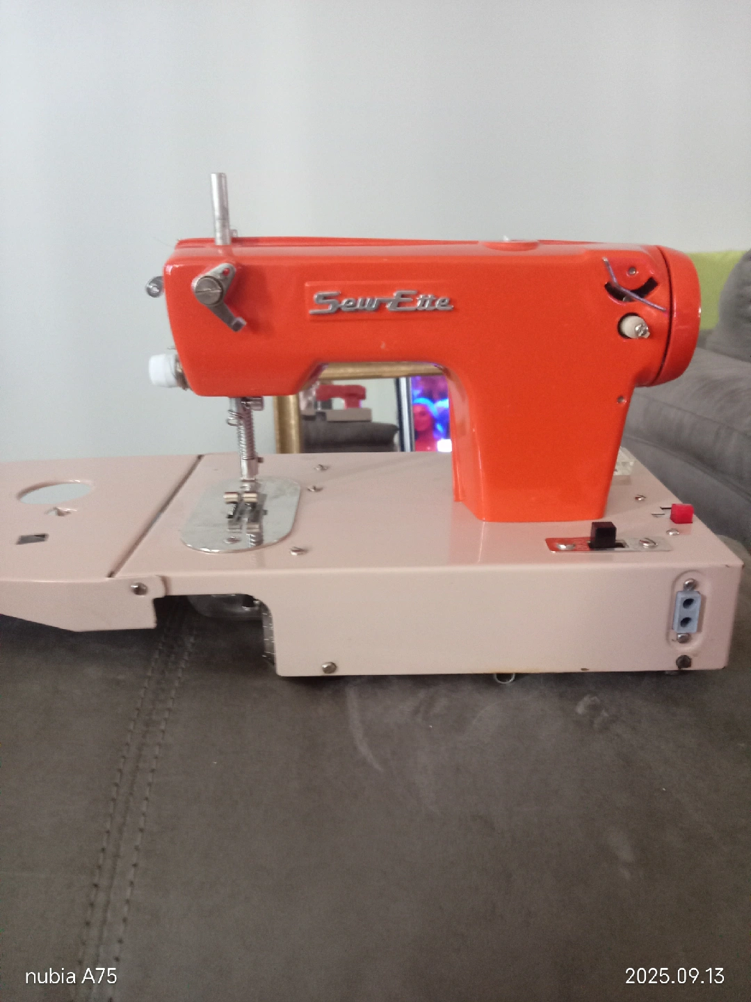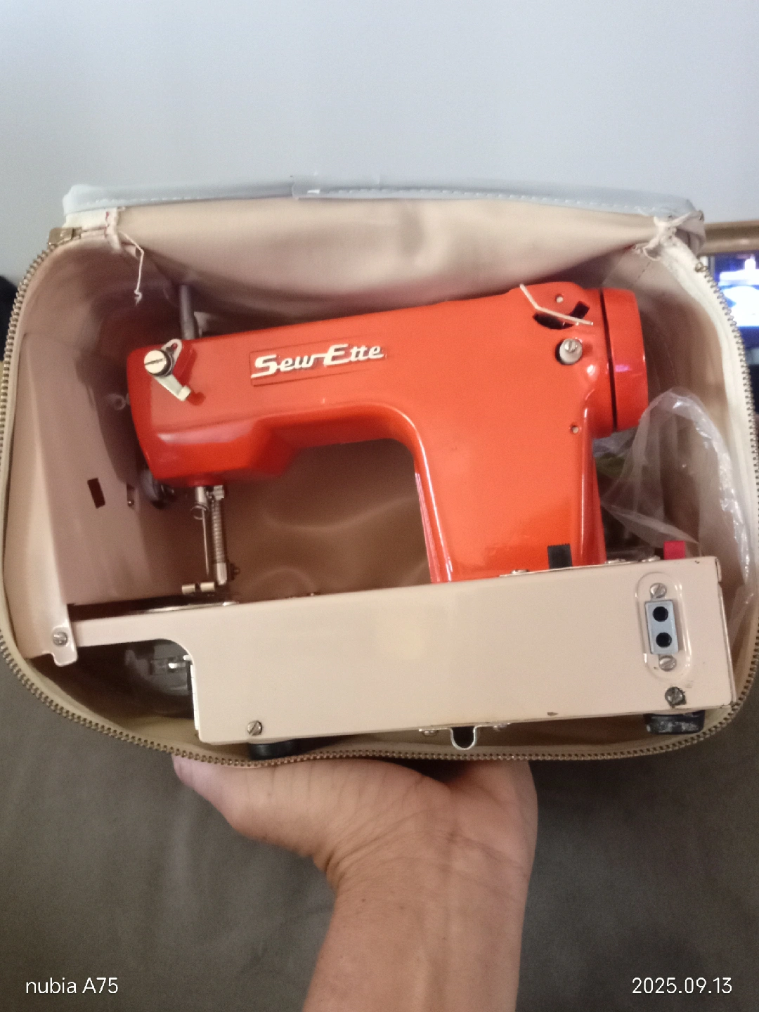 Selling a vintage Sew-Ette portable sewing machine! It comes with its original case and accessories, including a foot pedal, power cord, and a pack of Organ sewing machine needles. A great find for collectors or anyone interested in a classic sewing machine!