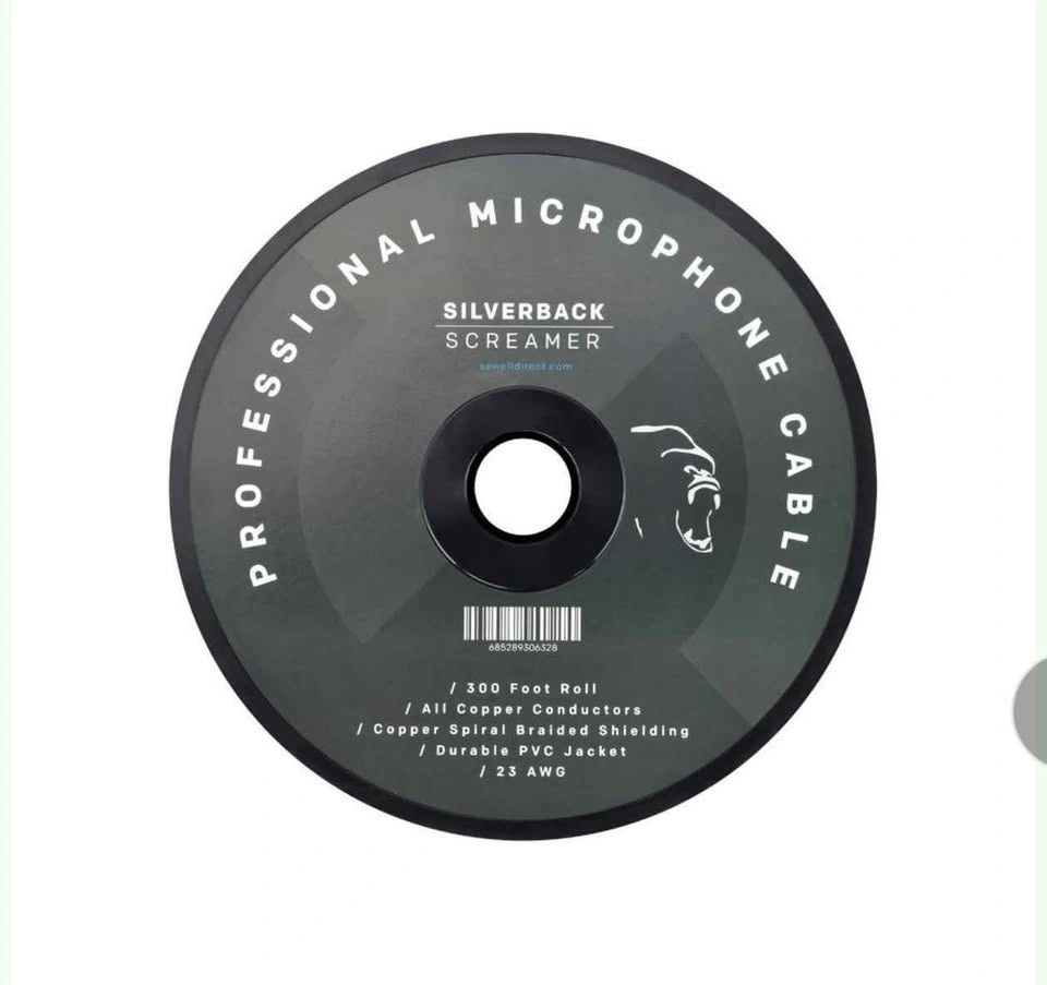 Sewell Silverback Screamer Bulk XLR Cable, 300 ft. Spool, Pure Copper, OFC, Flexible, Spiral Braided. Brand: Sewell Connector type: XLR Cable type: XLR Special feature: Braided Colour: Black Connector gender: Genderless Two 23 AWG bare copper conductors Pure oxygen-free copper wiring for greater durability, flexibility, and conductivity than CCA 96-strand pure copper shielding to protect against electromagnetic interference Non-woven cotton yarn support and 6.0 mm PVC jacket Spool broke so the wire is all loose but still brand new.