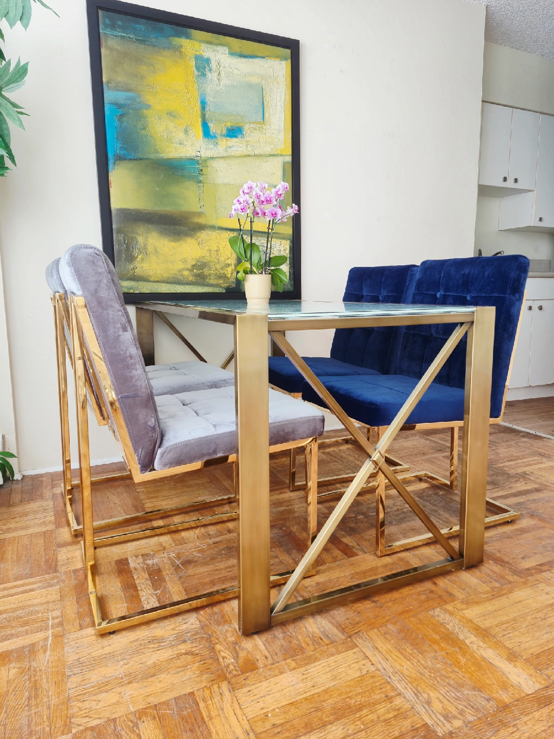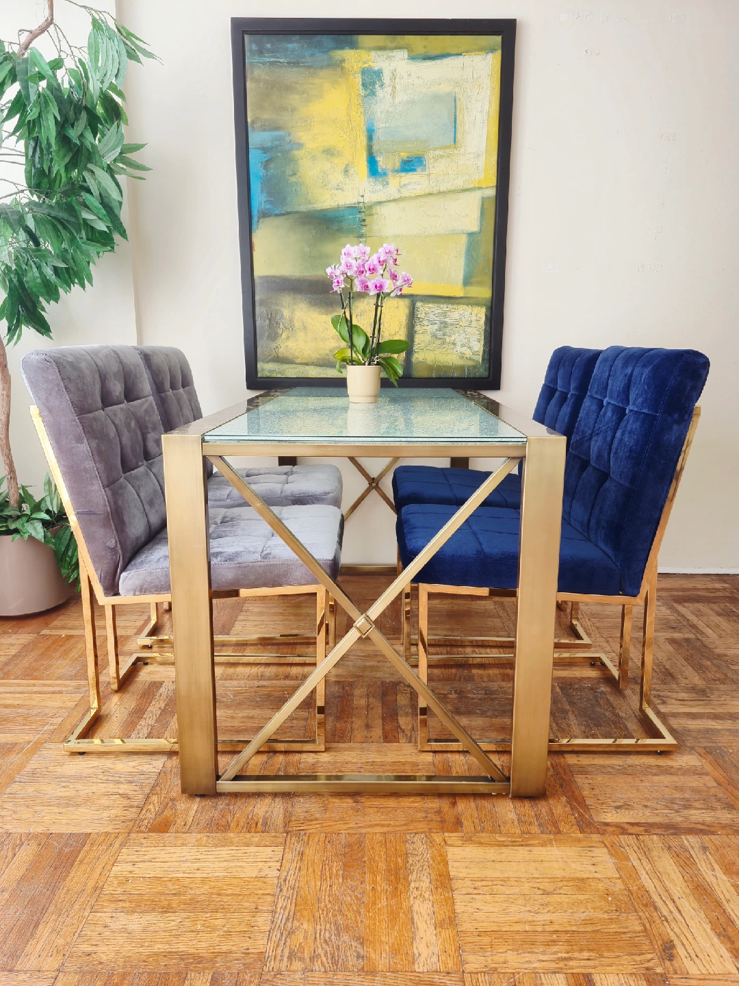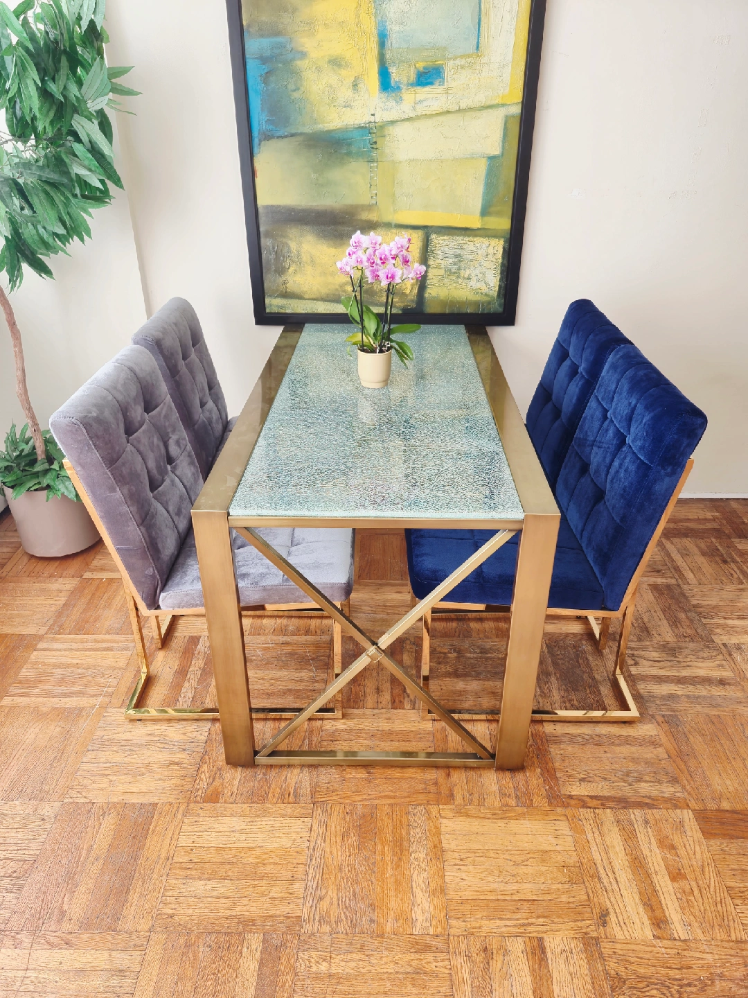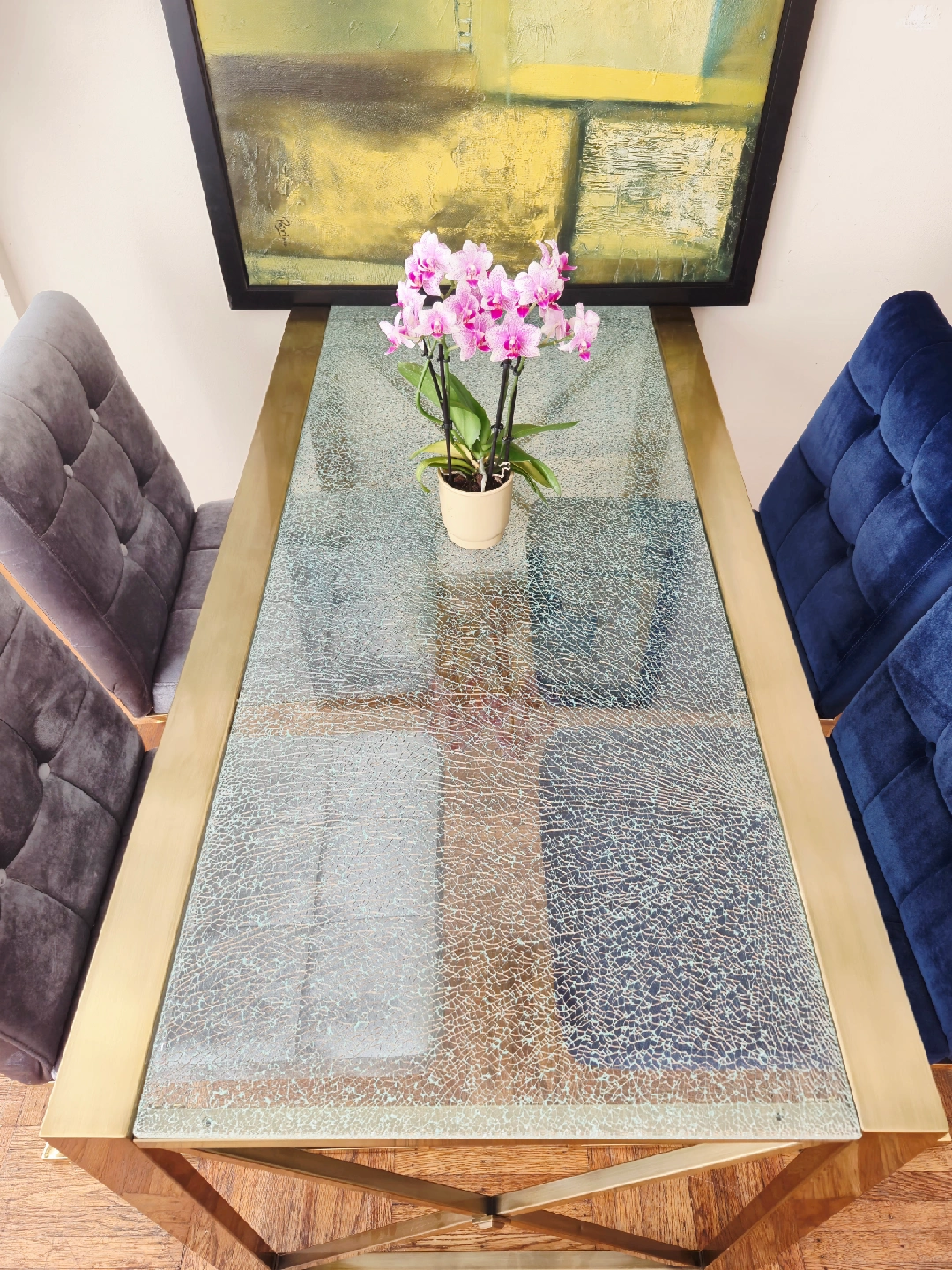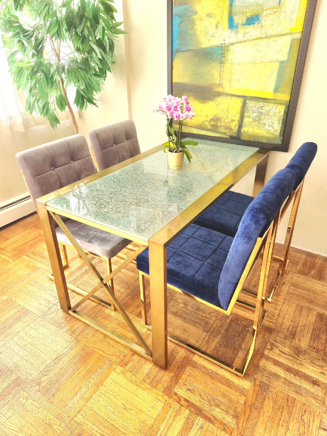 Modern chic rectangular dining table featuring an elegant gold metal base and a three layer tempered glass top surface with a shattered effect. Dimensions: 56"(w) × 30"(d) w 30"(h) Pick up in downtown Vancouver or delivery may be arranged for a reasonable fee. Priority is given to whom is able to pick up. Follow us on Instagram: https://www.instagram.com/vanvaluevintage Tags: console Table hallway table sofa table solid wood mahogany walnut maple brass gold copper plant stand tv bench credenza sideboard Hutch server buffet living room dining room retro vintage antique rental set dec mcm cb2 eq3 west elm vintage retro antique console table delivery modern Contemporary industrial chic glam gold brass dining set table desk cb2 eq3 west elm pottery barn crate and barrel structube article urban barn moes Scandesign rove concept vanvaluevintage westendtrends