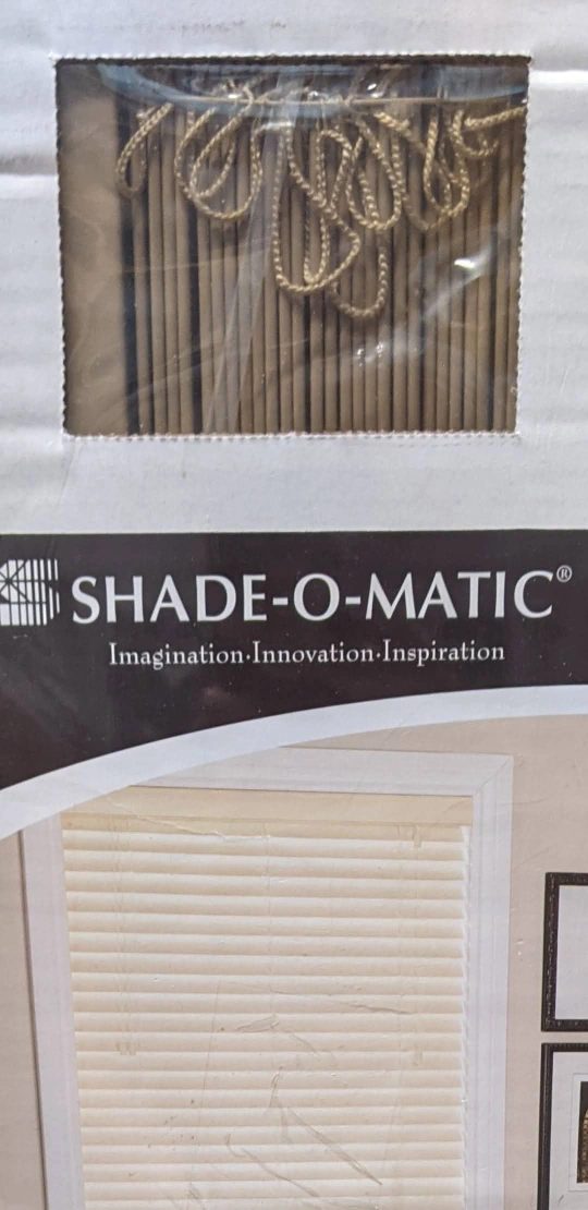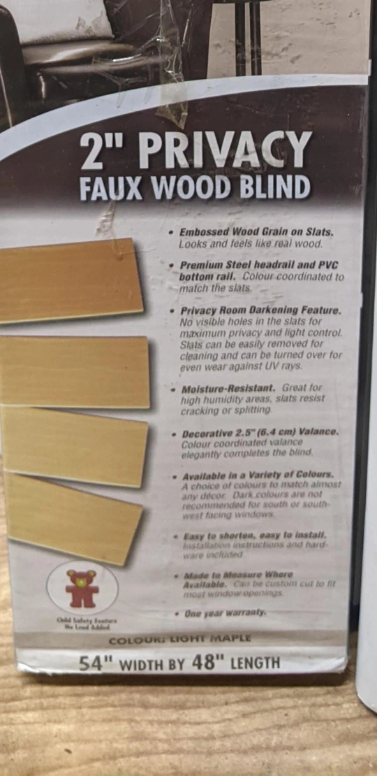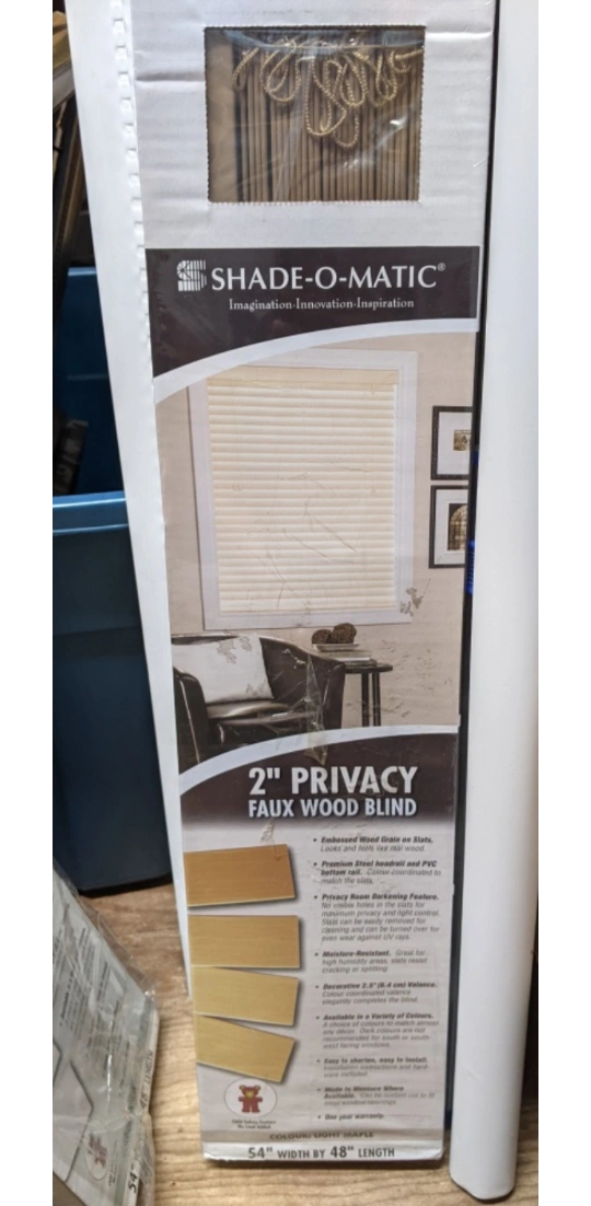 NEW IN BOX 2" privacy faux wood blind. Light maple colour. Features embossed wood grain, privacy room darkening, and moisture resistant slats. Includes decorative valance.
