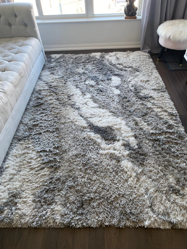 This is a shaggy area rug in a blend of grey and white tones. It's in good condition and would add a cozy touch to any room!