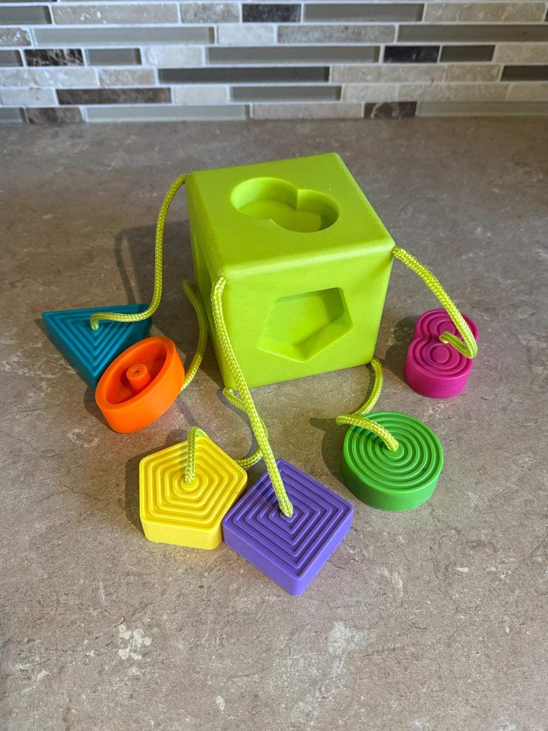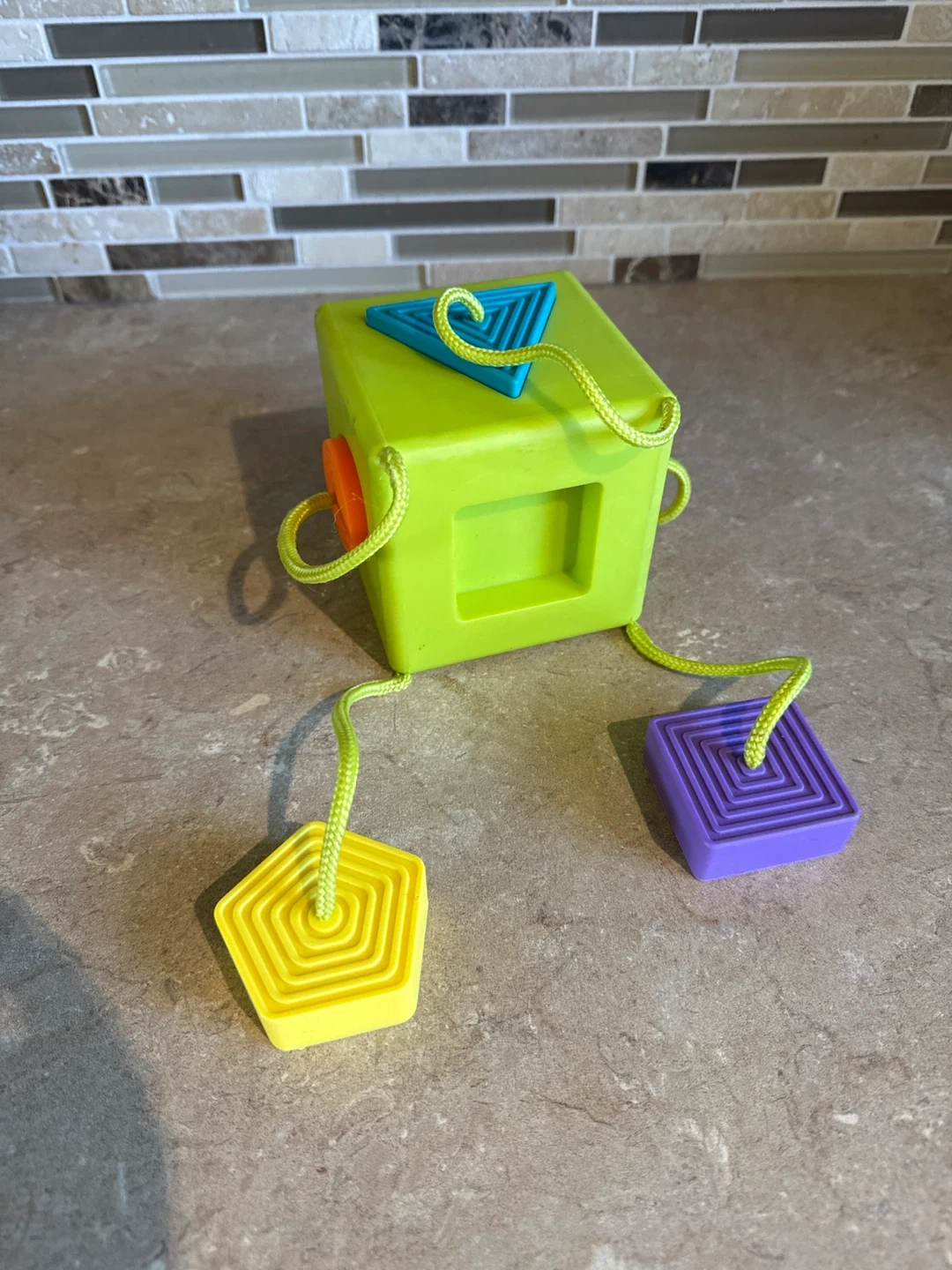 This shape sorter cube is a fun and educational toy for toddlers! It helps develop fine motor skills and shape recognition. The cube comes with various colourful shapes that fit into corresponding holes. It's in great condition and ready for a new home!