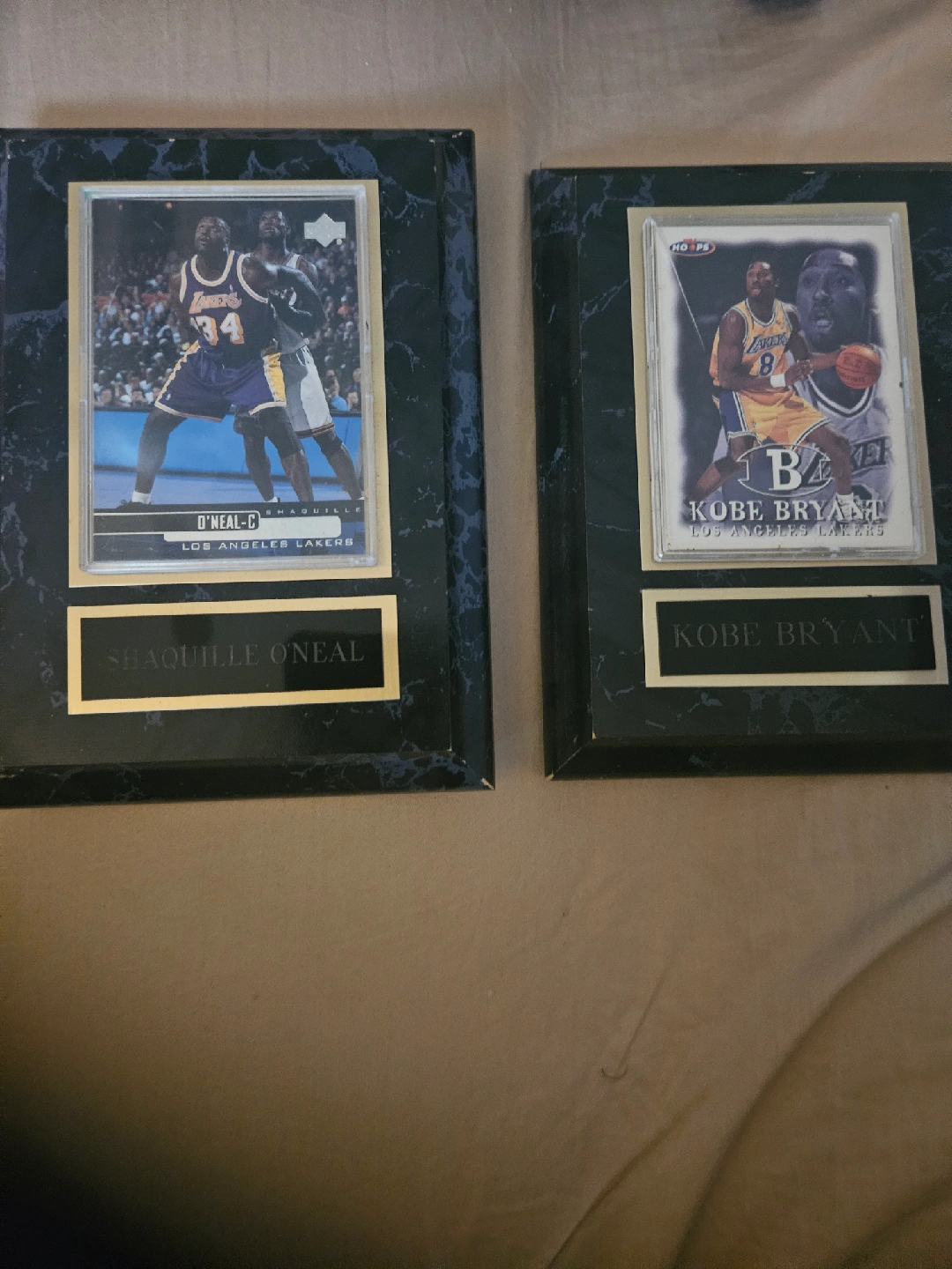 Selling two framed basketball cards featuring Shaquille O'Neal and Kobe Bryant of the Los Angeles Lakers. They are in good condition and would look great in any sports fan's collection!