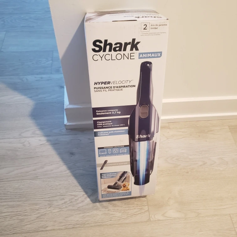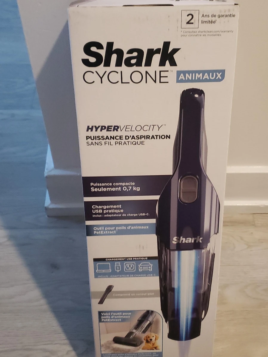 Selling a Shark CYCLONE Animaux HyperVelocity cordless vacuum! It's lightweight at only 0.7 kg and has strong suction power. It comes with a USB charging adapter and a tool for pet hair removal. Compact and convenient for quick cleanups!