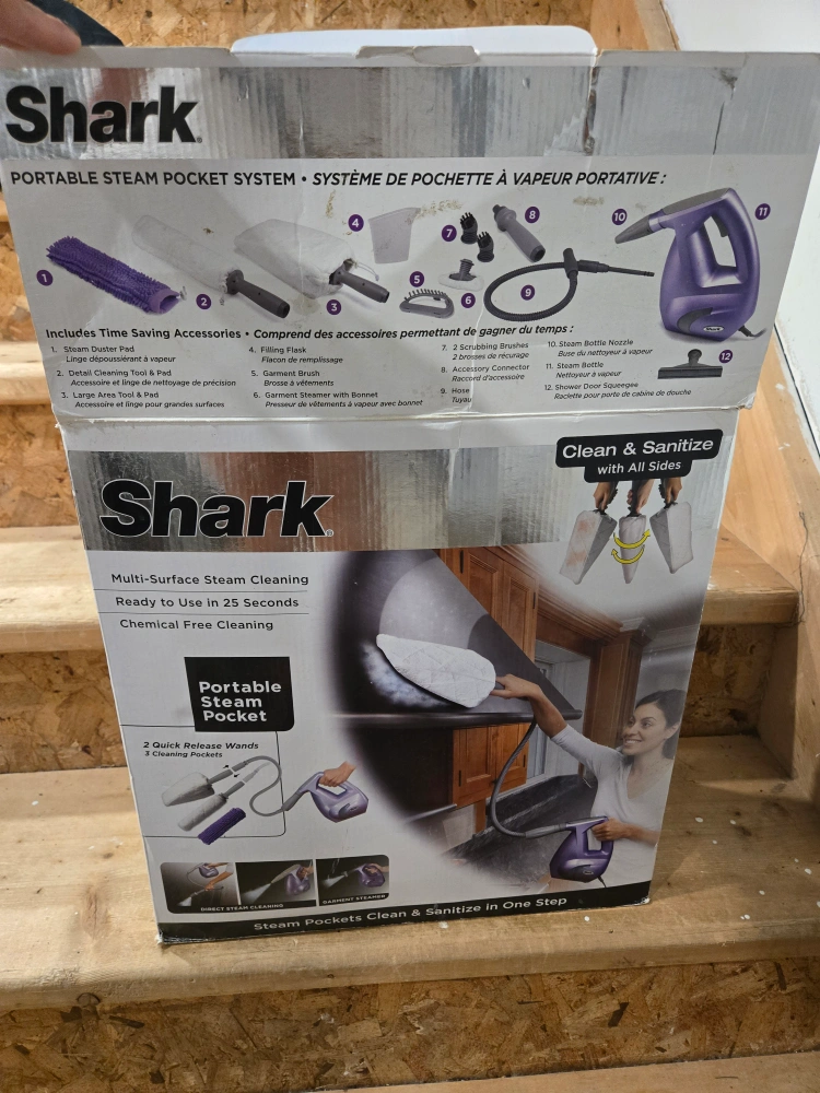 Selling a Shark Portable Steam Pocket System! It's ready to use in just 25 seconds and offers chemical-free cleaning. The system includes various accessories for different cleaning needs and comes with the original box. Clean and sanitize all sides with this handy steam pocket system