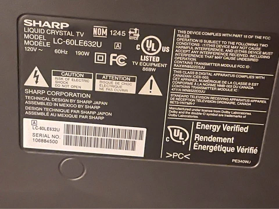 Sharp LC-60LE632U 60-inch full HD 1920x1080 native resolution display. Does not come with tabletop stand or remote. Not Smart.