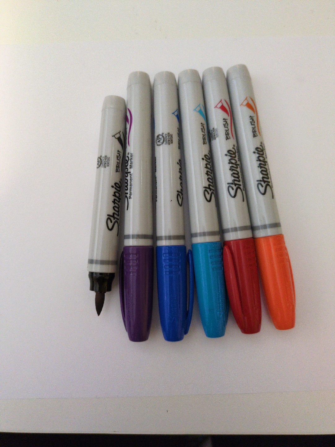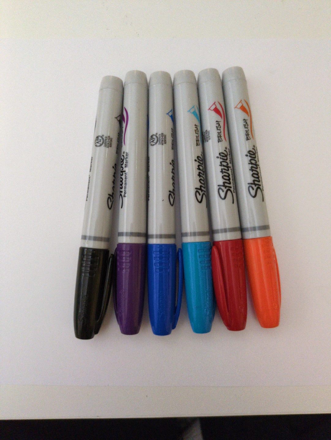 Selling a set of 6 Sharpie brush tip permanent markers in various colours, including black, purple, blue, turquoise, red, and orange. Perfect for artists and crafters!