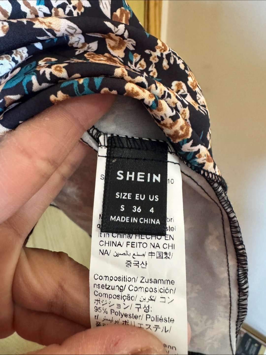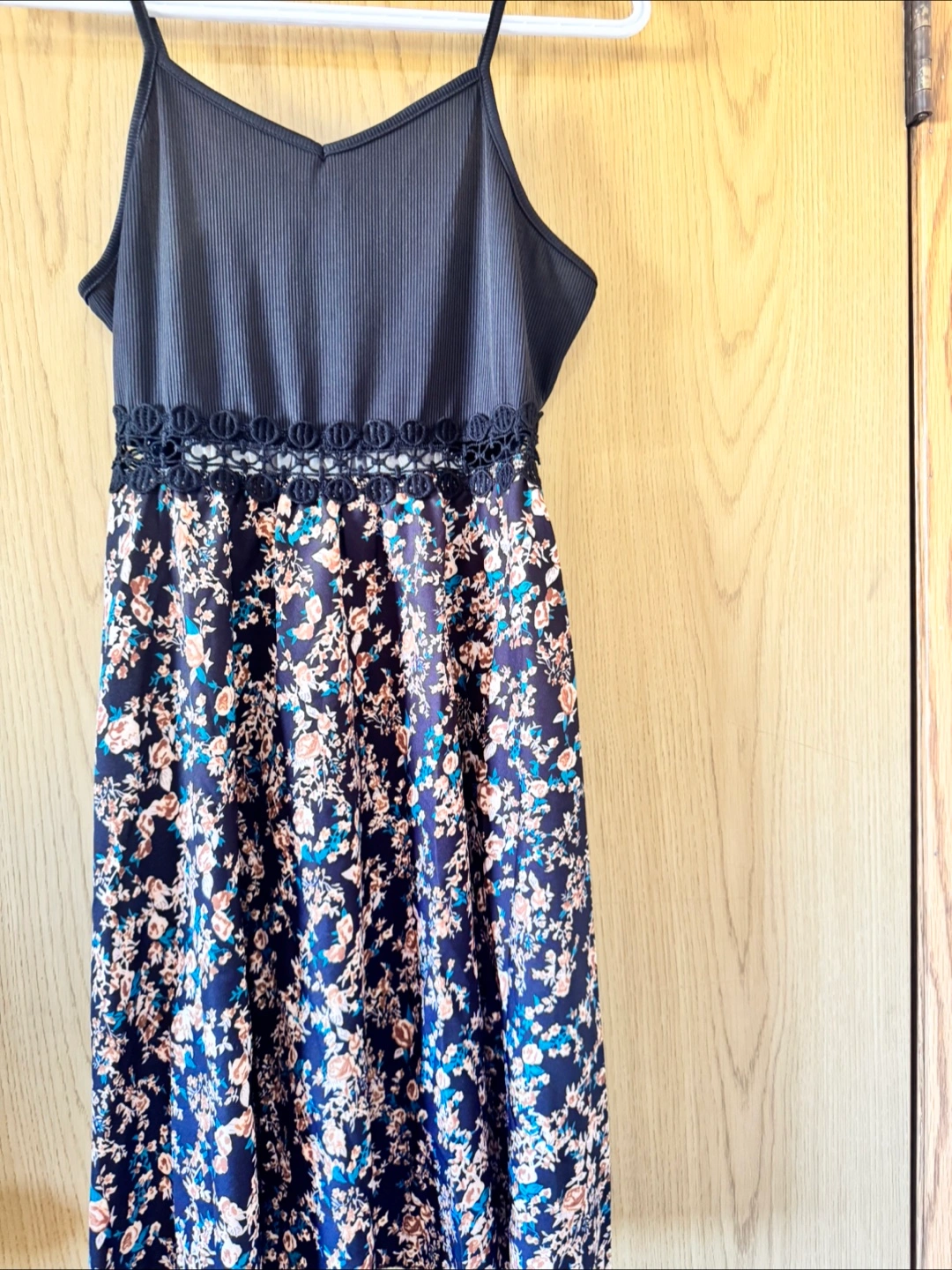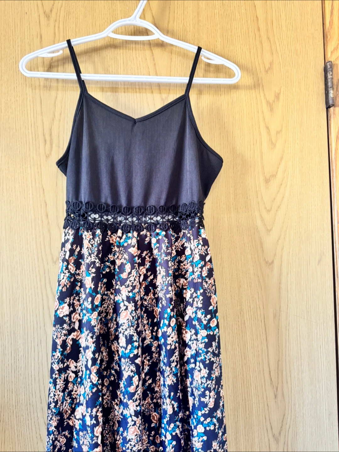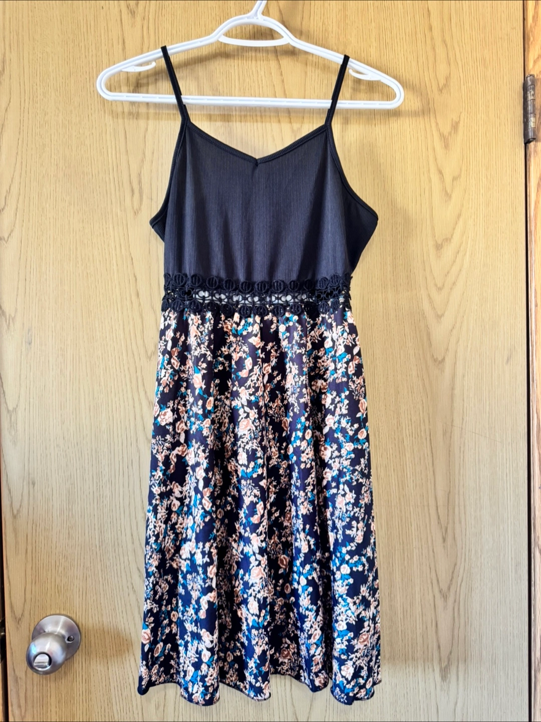 Selling a cute Shein cami dress with a floral print! It features a black, ribbed top and a flowy skirt with a lovely floral pattern. The dress is a size small and made of 95% polyester. Perfect for a casual day out!