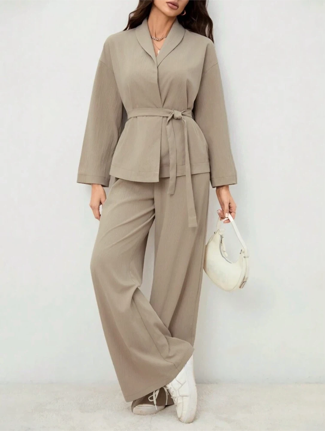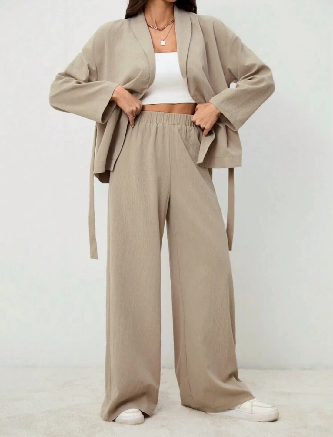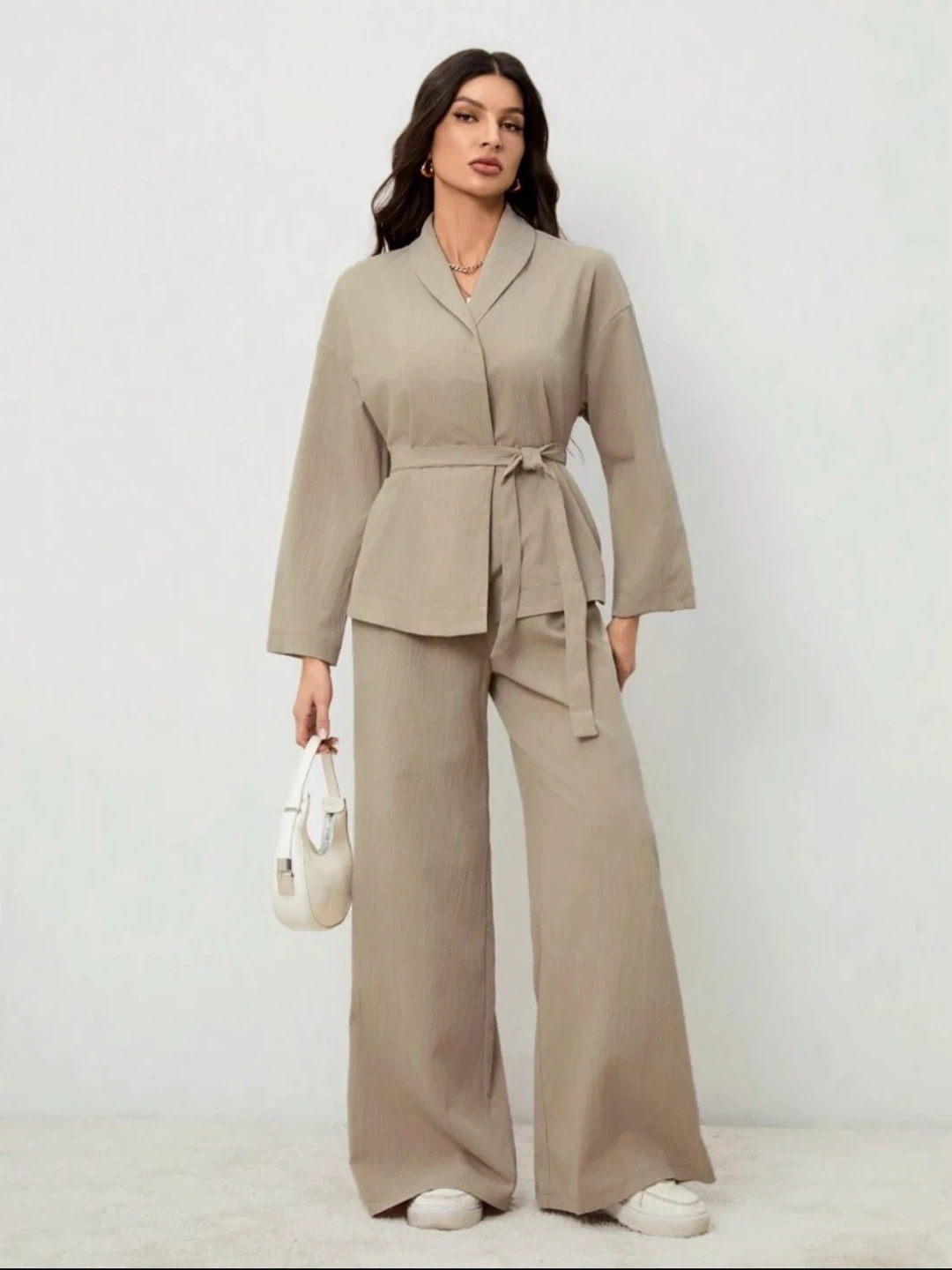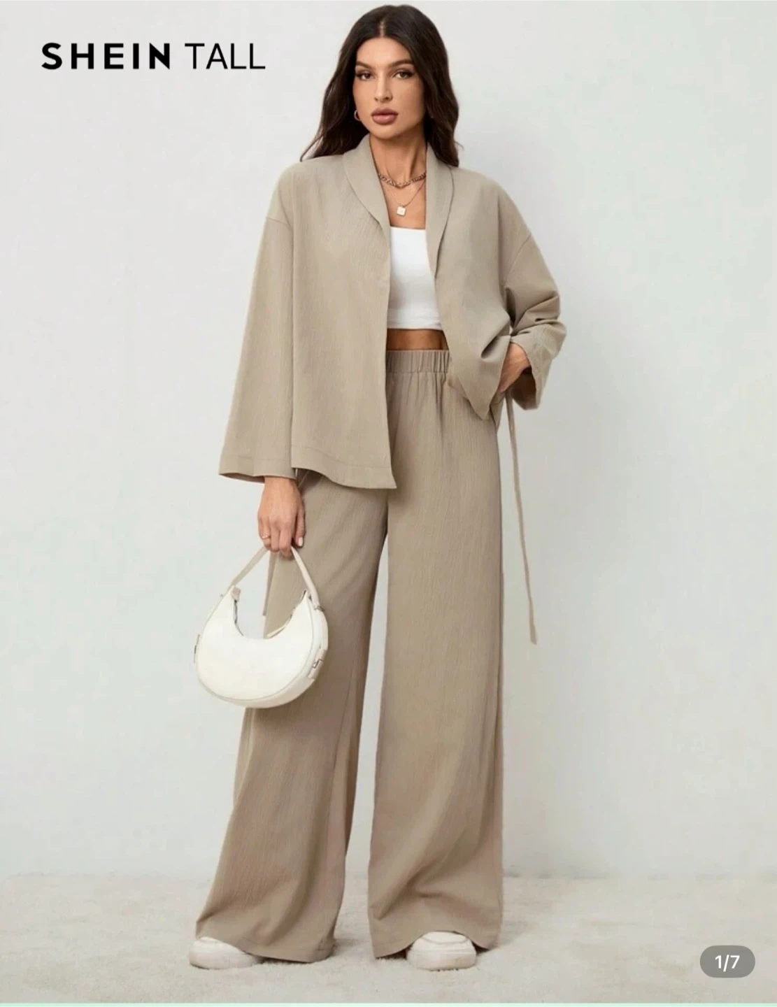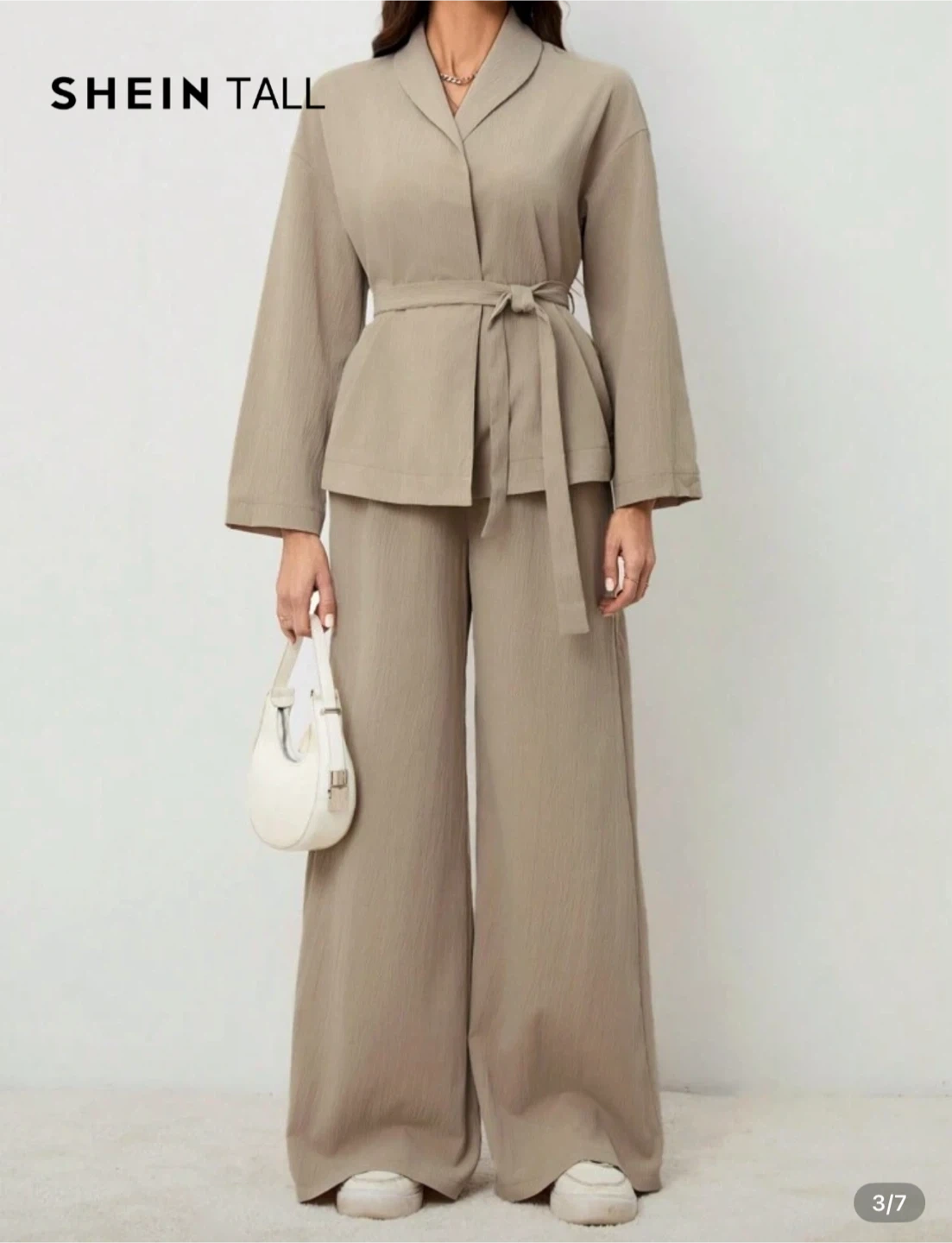 Selling a SHEIN Tall co-ord set in a lovely beige colour. The set includes a belted top and wide-leg pants. It's a stylish and comfortable outfit! Size is a large I got it yesterday and I got the wrong size so I’m selling it for same price
