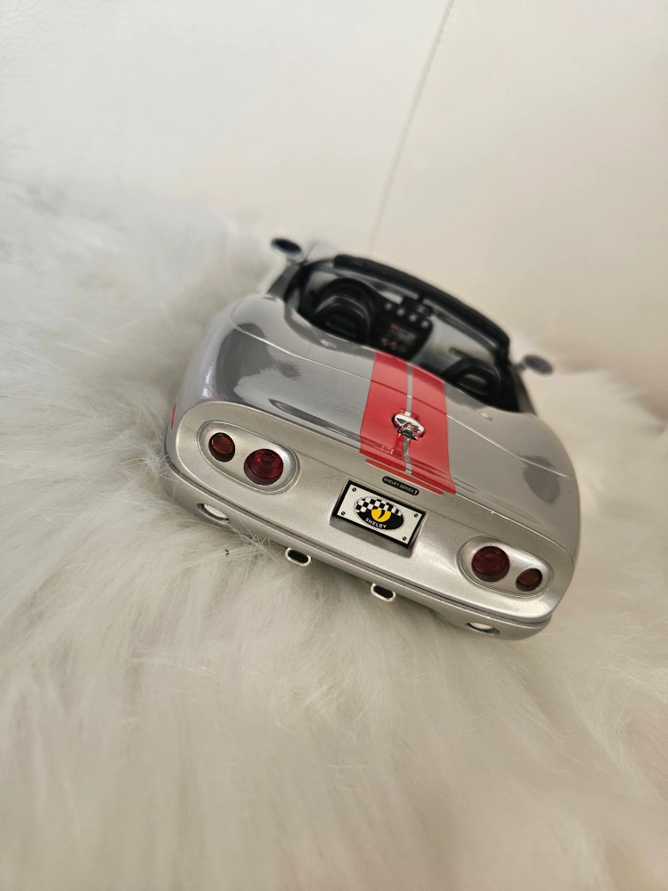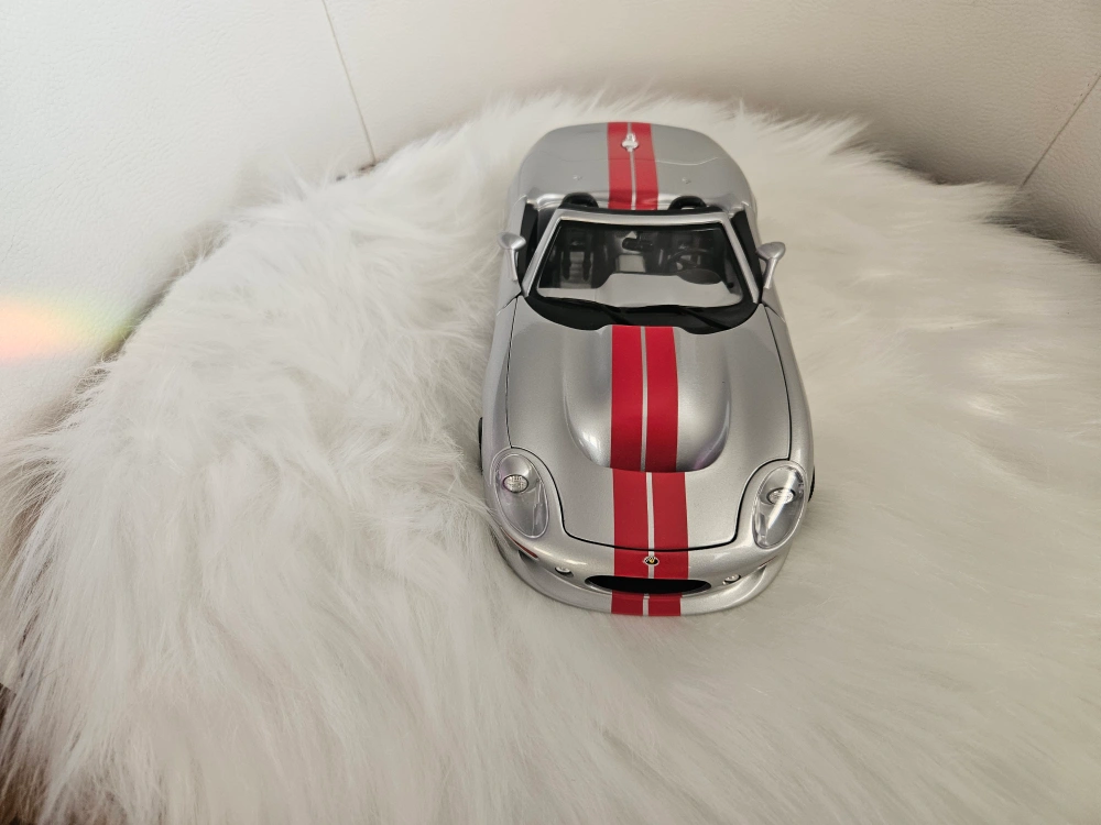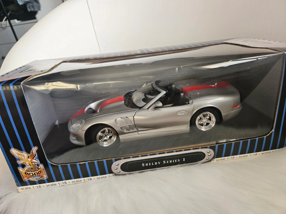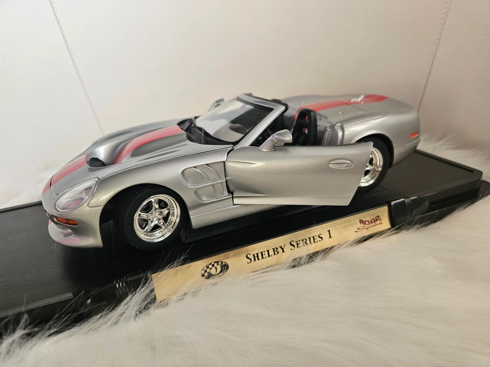 Selling a 1:18 diecast model of a Shelby Series 1 car by Road Signatures/Yat Ming. It's silver with red racing stripes and has opening doors. A great addition to any car collection! Preowned (was on display)