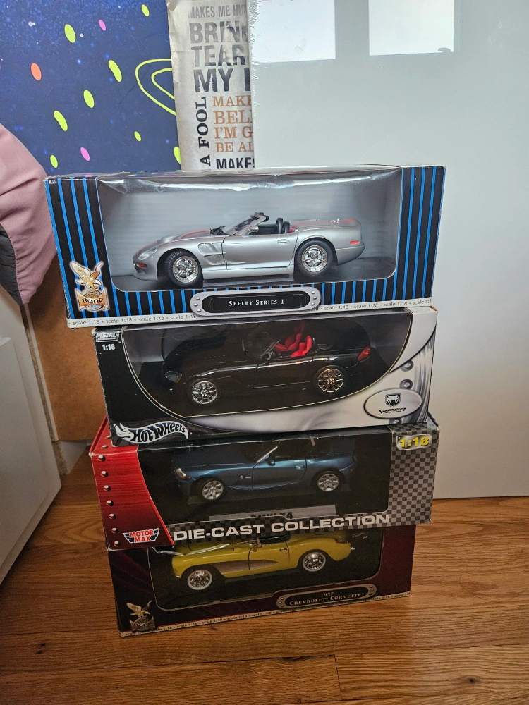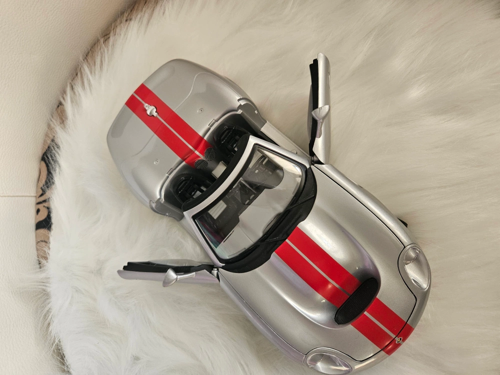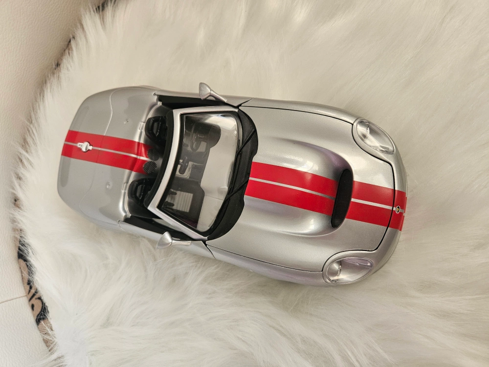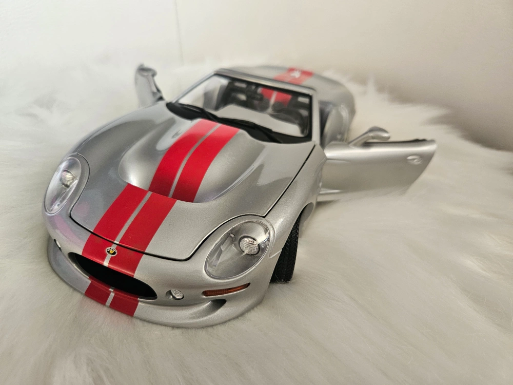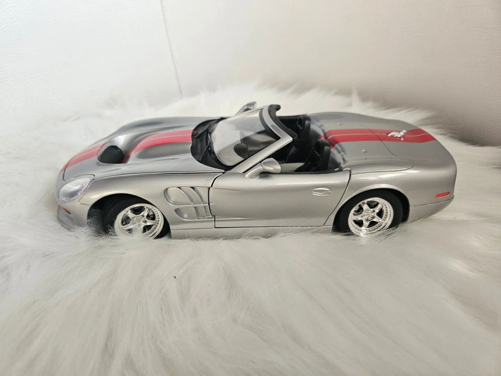 Selling a 1:18 diecast model of a Shelby Series 1 car by Road Signatures/Yat Ming. It's silver with red racing stripes and has opening doors. A great addition to any car collection! Preowned (was on display)