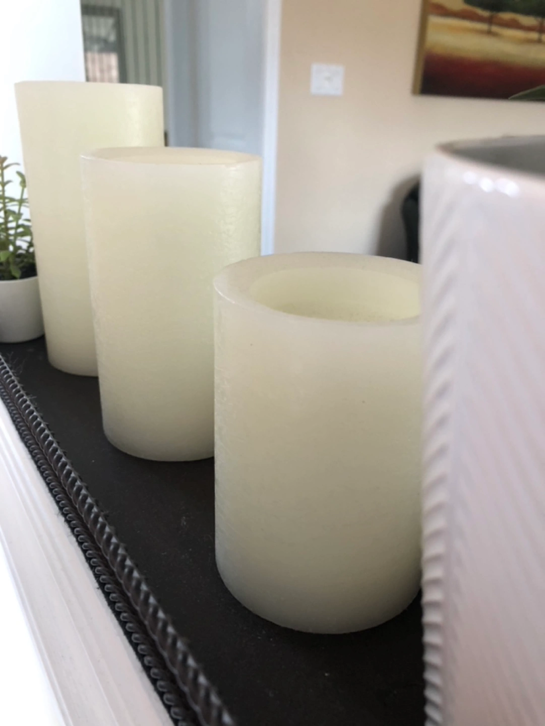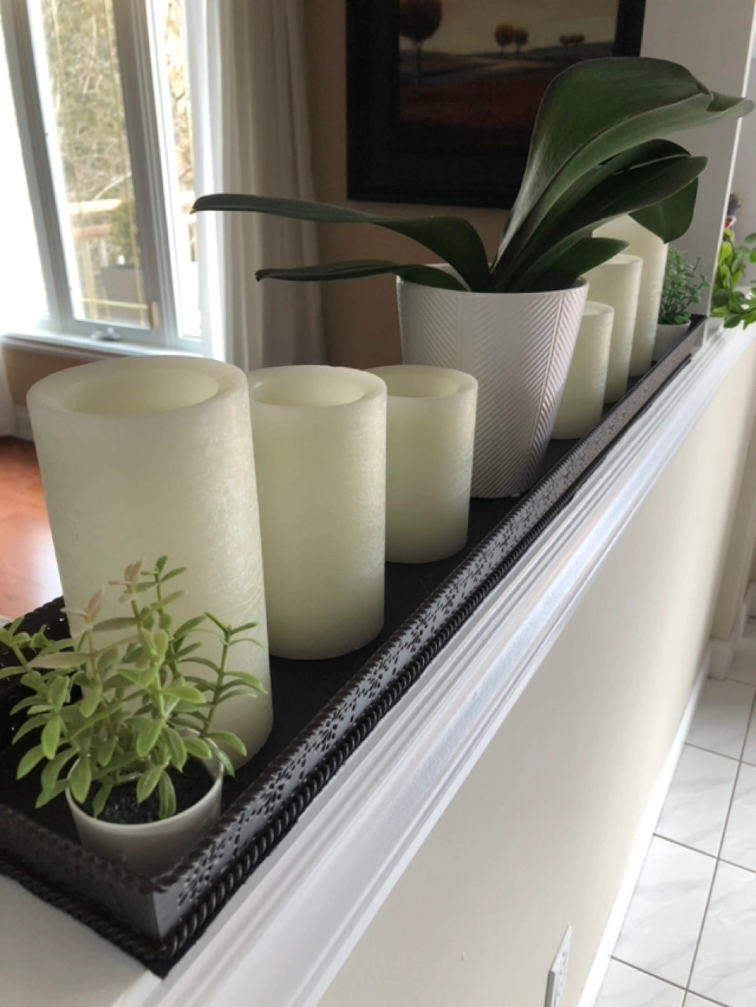 Shelf box is metal and fits most ledges and mantles. Has protective felt on bottom so won’t scratch any surfaces. 6 Flameless candles comes with remote. Must buy as a set. Plants not included.