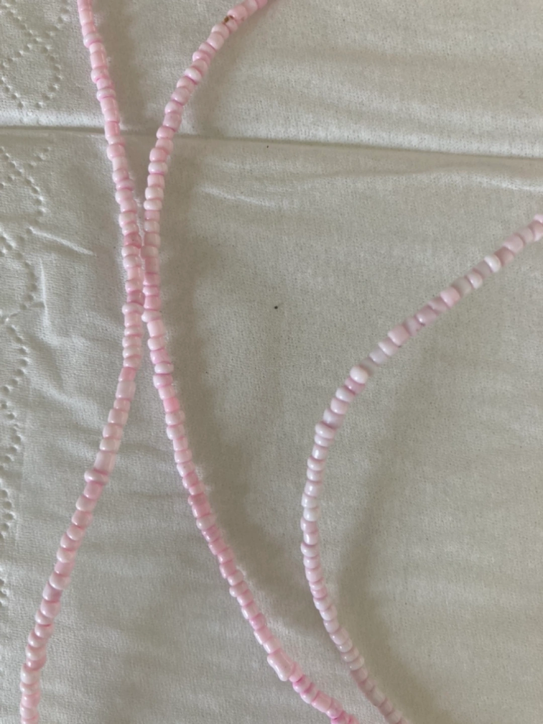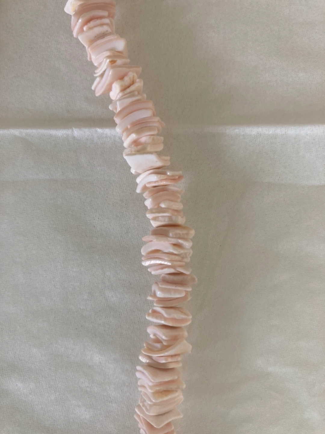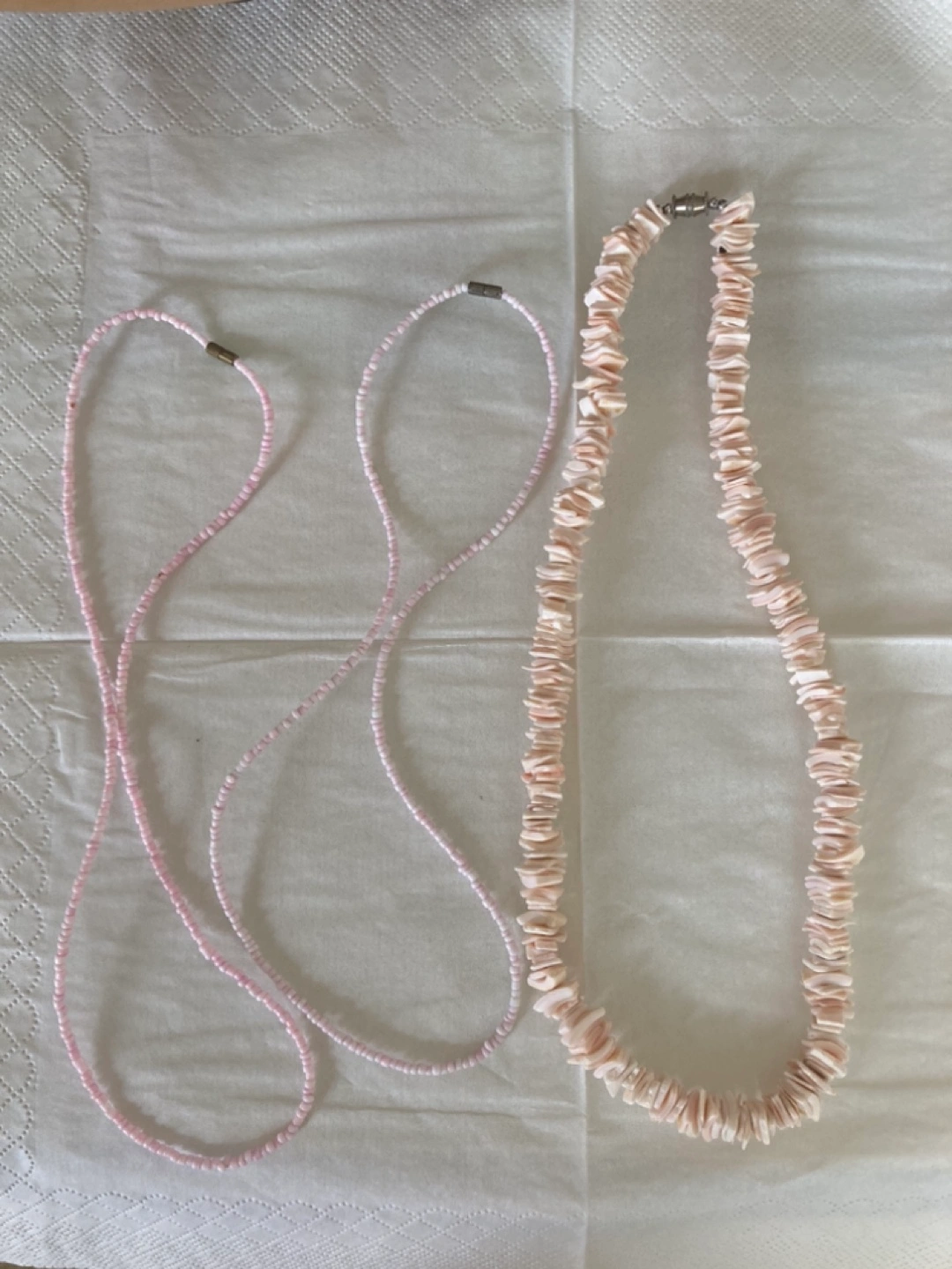 Two small pale pink bead necklaces. One shell necklace (flat shell pieces)