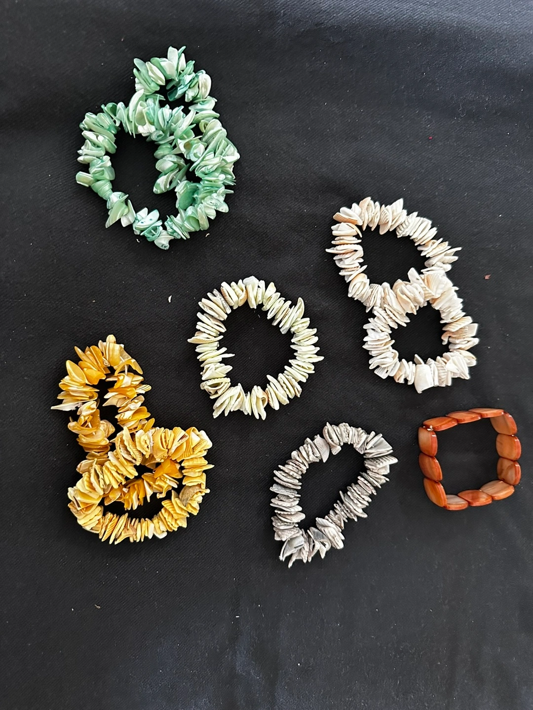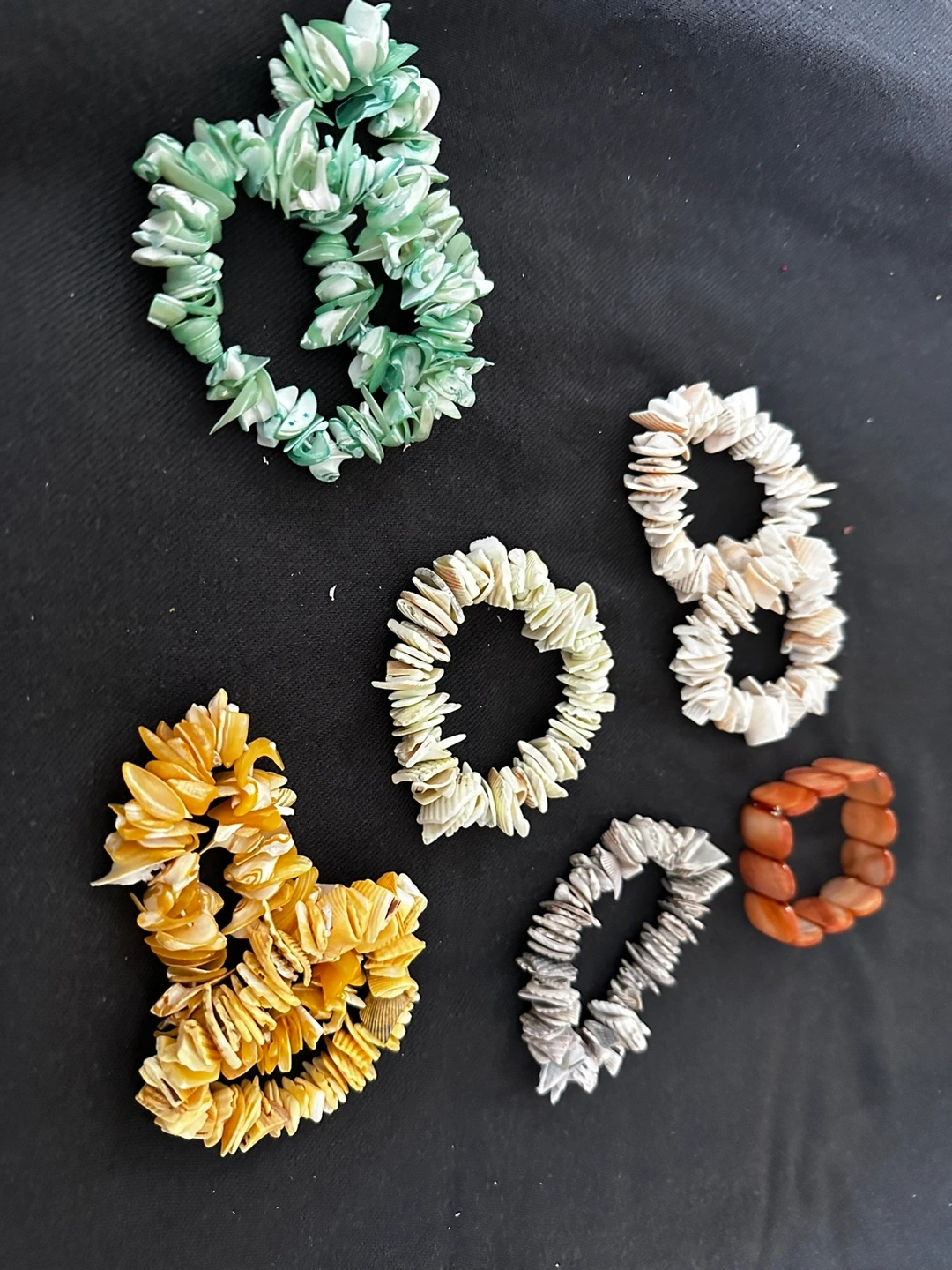 I have a collection of shell bracelets for sale. There are six in total, each with a unique colour and design. They're perfect for adding a touch of summer to any outfit!
