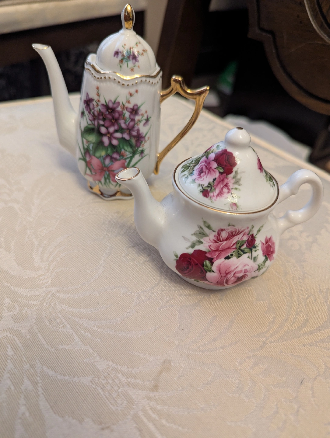 Selling a set of two adorable mini teapots from the Shelly Ann Collection! They're made of fine bone china and feature beautiful floral designs. One is decorated with violets, and the other with roses. Both are in great condition and would make a lovely addition to any collection