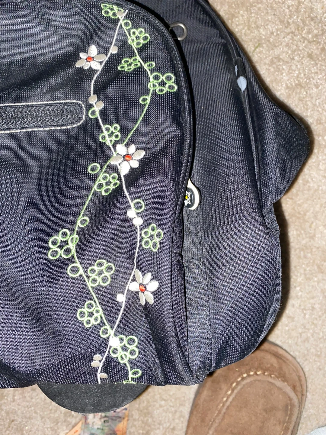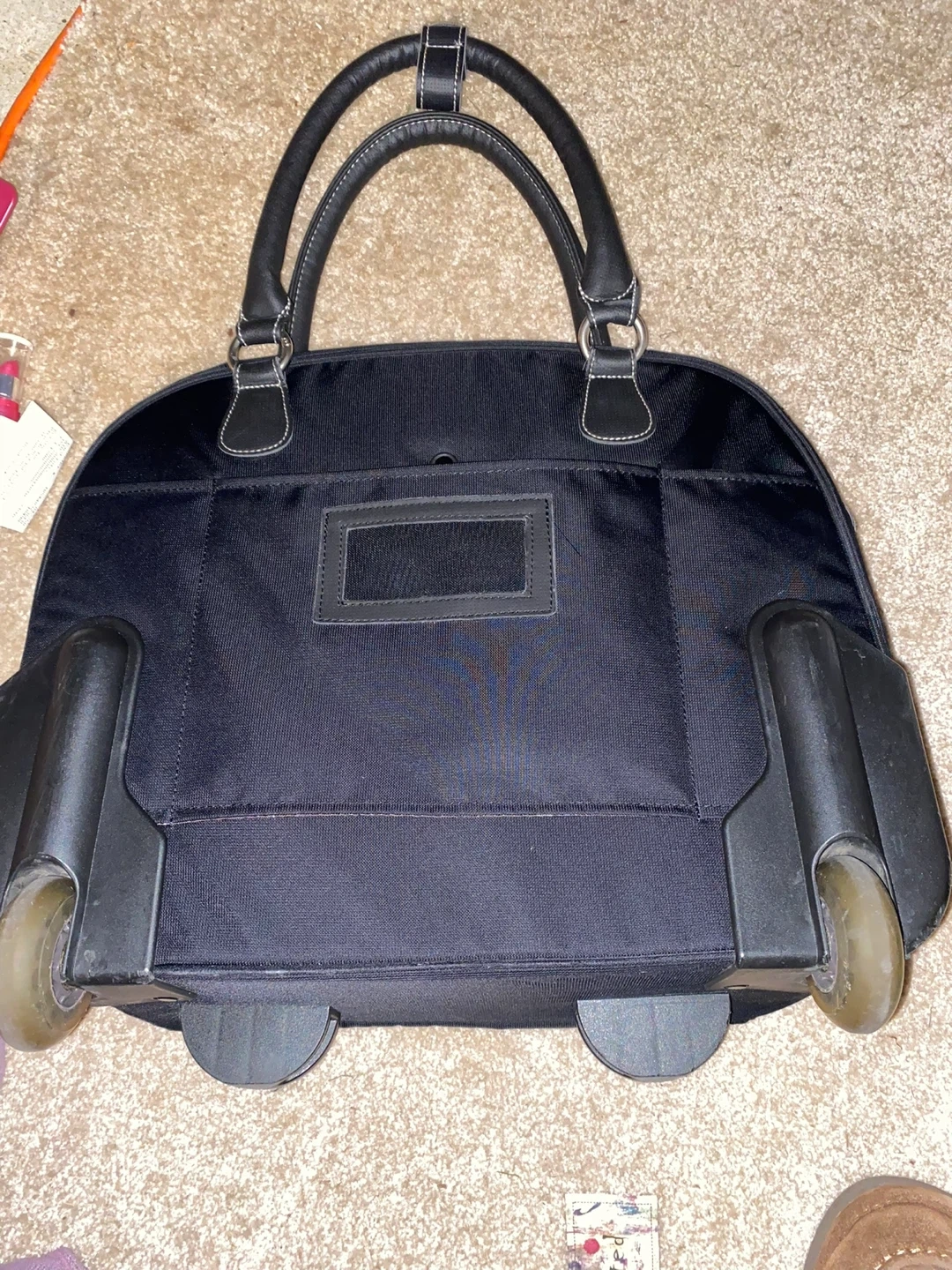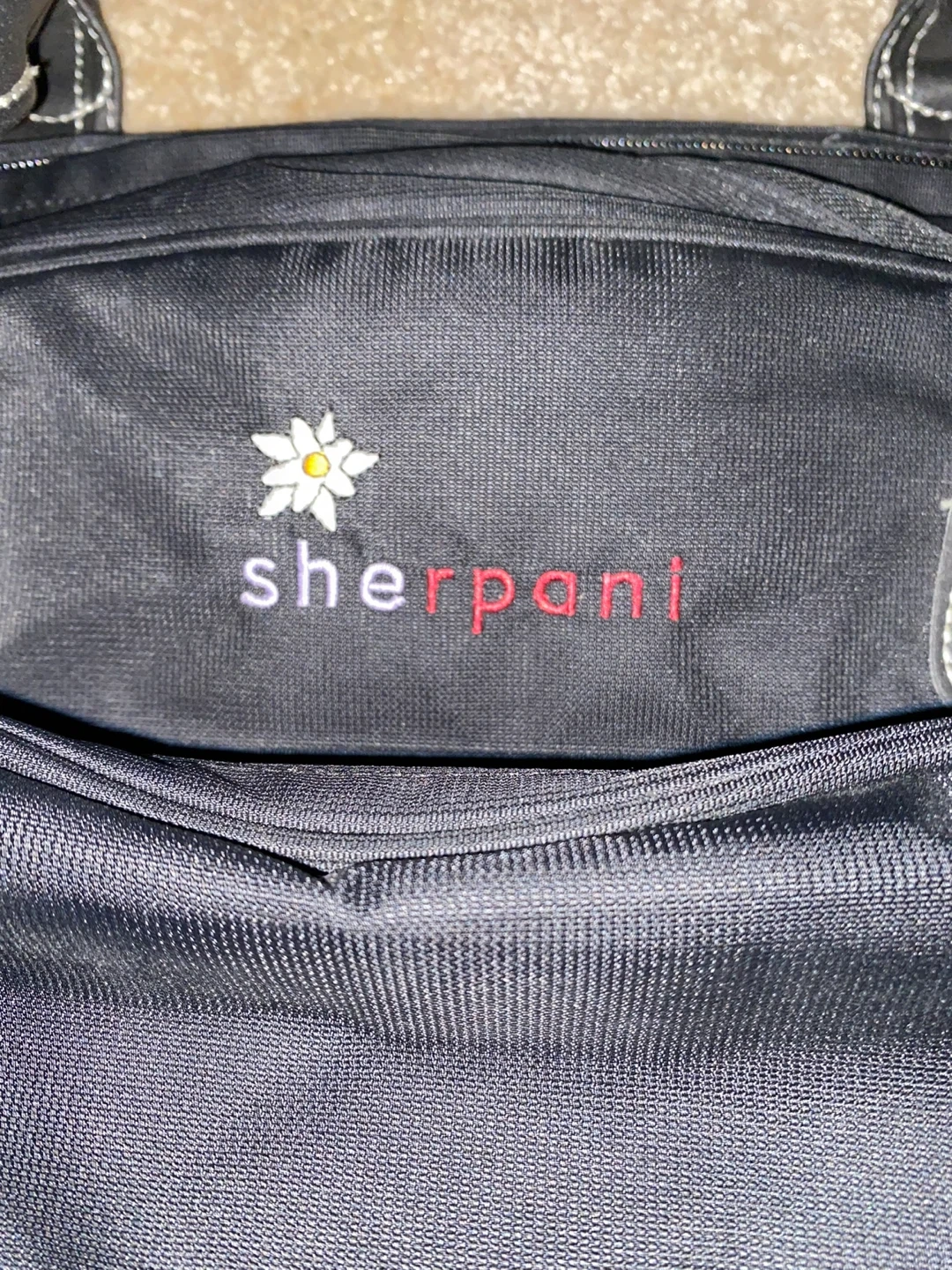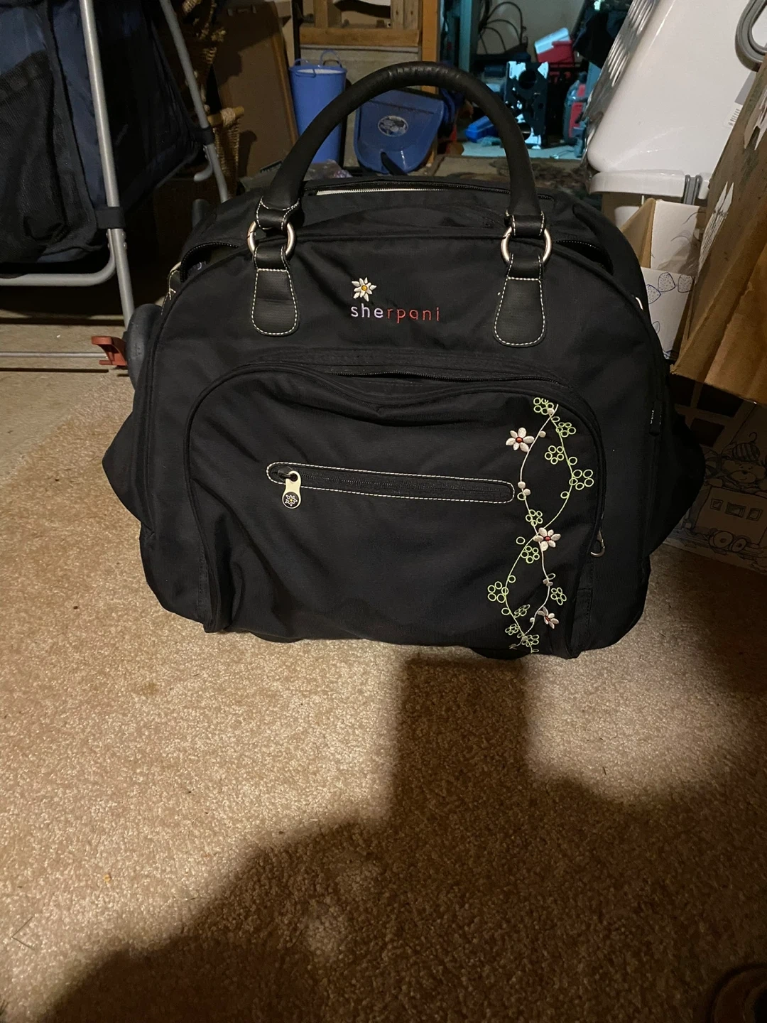 Selling a black Sherpani rolling travel bag. It has a floral design on the side and is in good condition. Perfect for travel or everyday use! Extendable handle