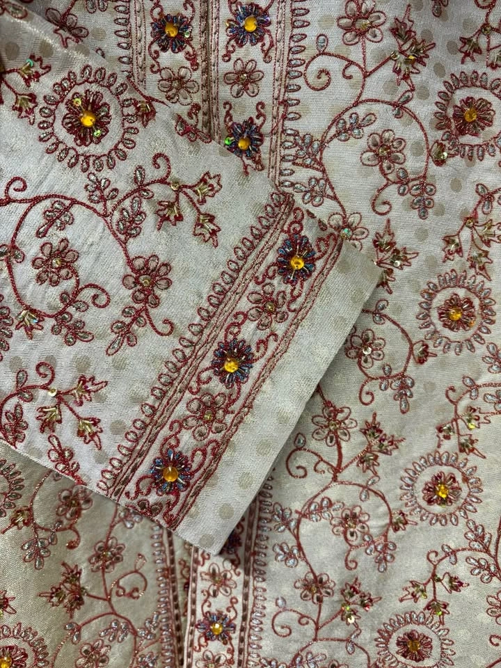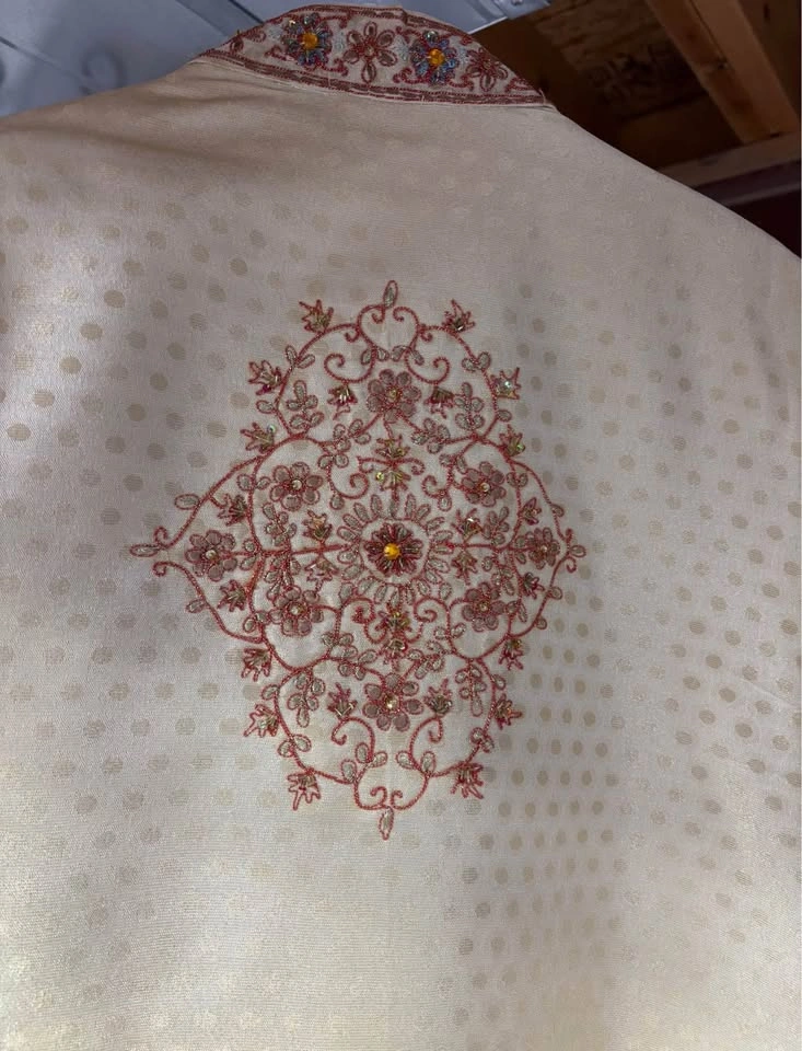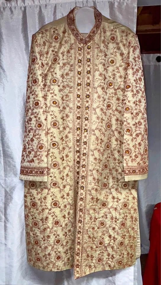 Traditional Indian groom’s outfit — men’s sherwani, embroidered front and back. Comes with men’s churidar pants. Sherwani chest: 22” Pants length: 50” Feel free to message if you have any questions!