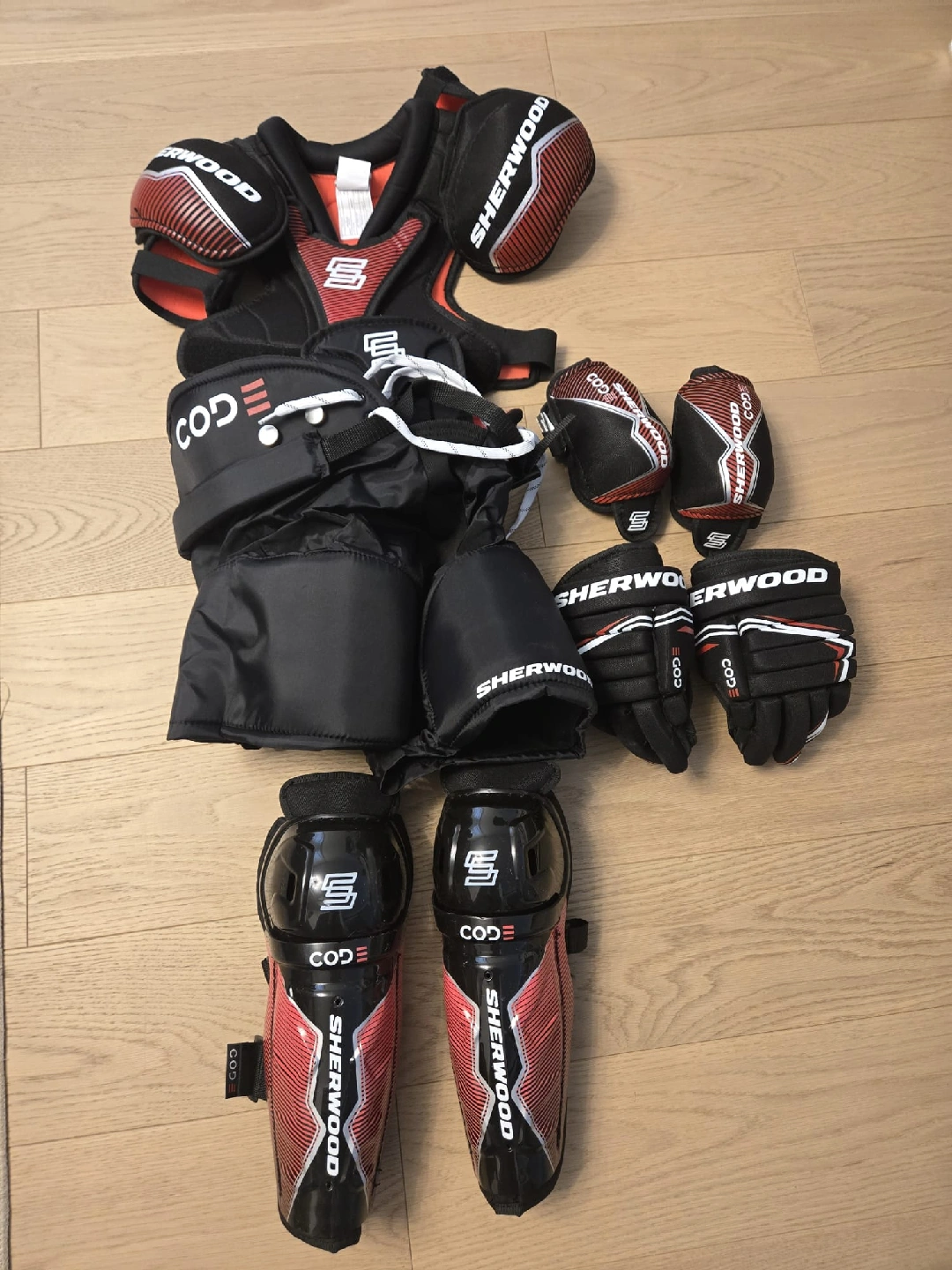 Get your young hockey player ready to hit the ice with this Sherwood CODE premium youth hockey starter kit! This set includes everything your child needs to stay protected and comfortable while playing. The kit is a size L/G, recommended for ages 7-9. It includes shoulder pads, elbow pads, gloves, and pants. A great set for the competitive youth player!