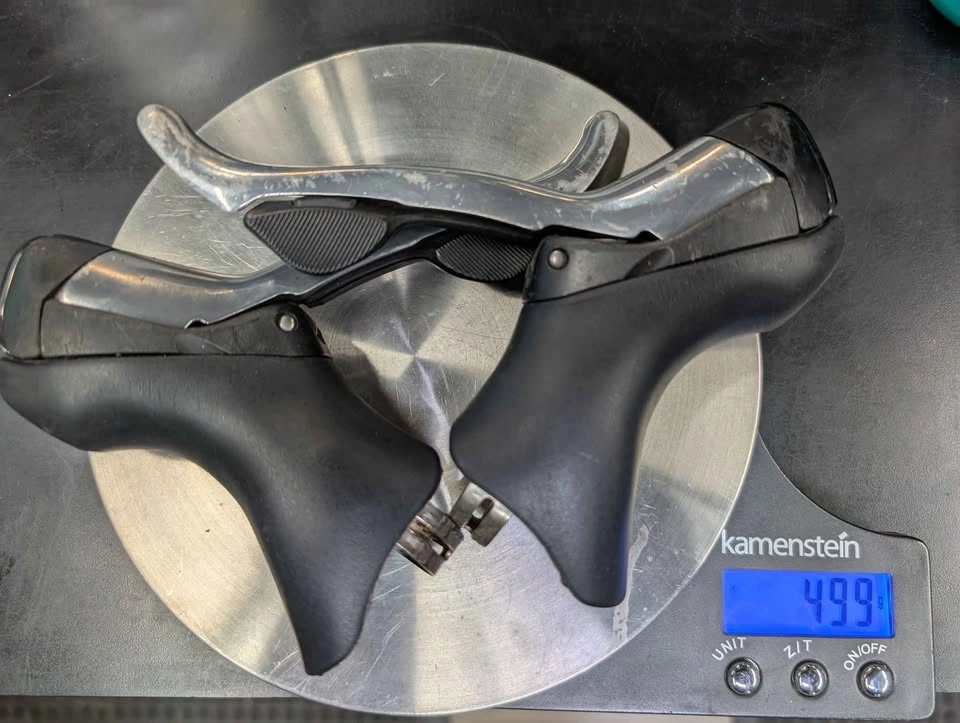 Right shifter is 10 speed, left shifter is 3 speed. New hoods were just installed. Few scuffs, but 105 shift badges are in excellent shape