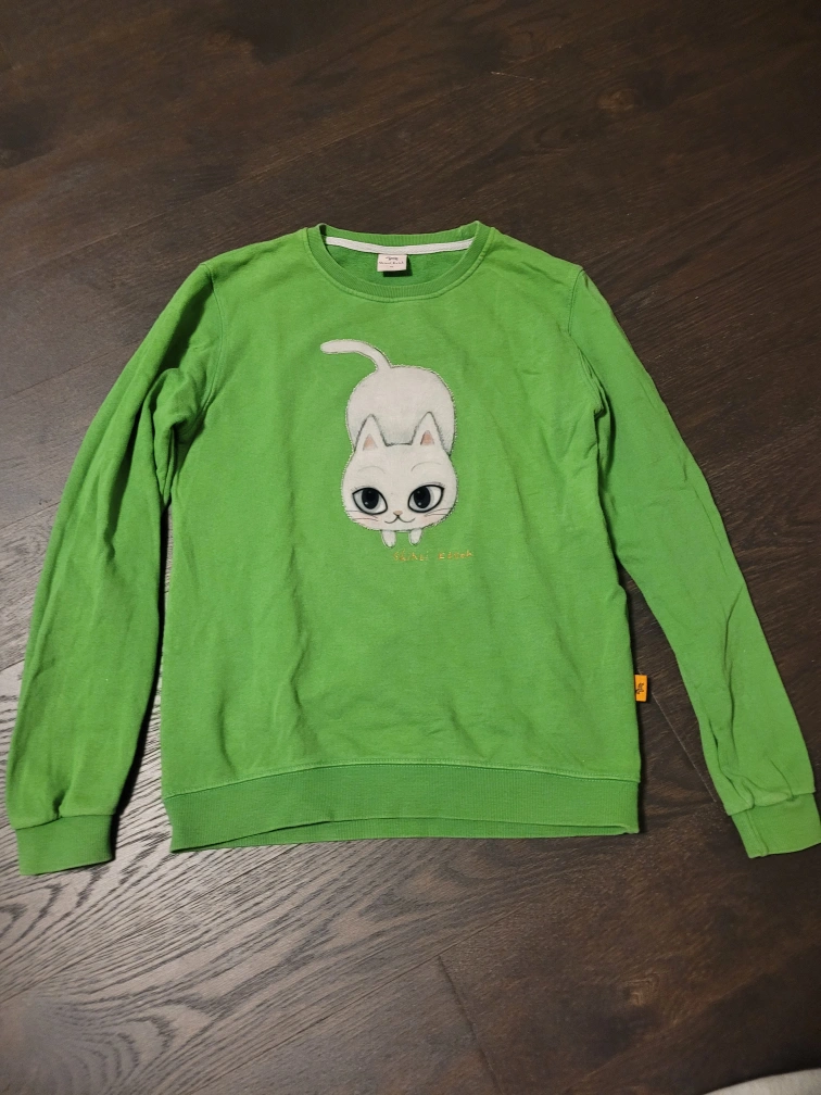 Green long-sleeved sweater with a white cat design. Size XS (adult). Good condition. No deliveries, pickup only.