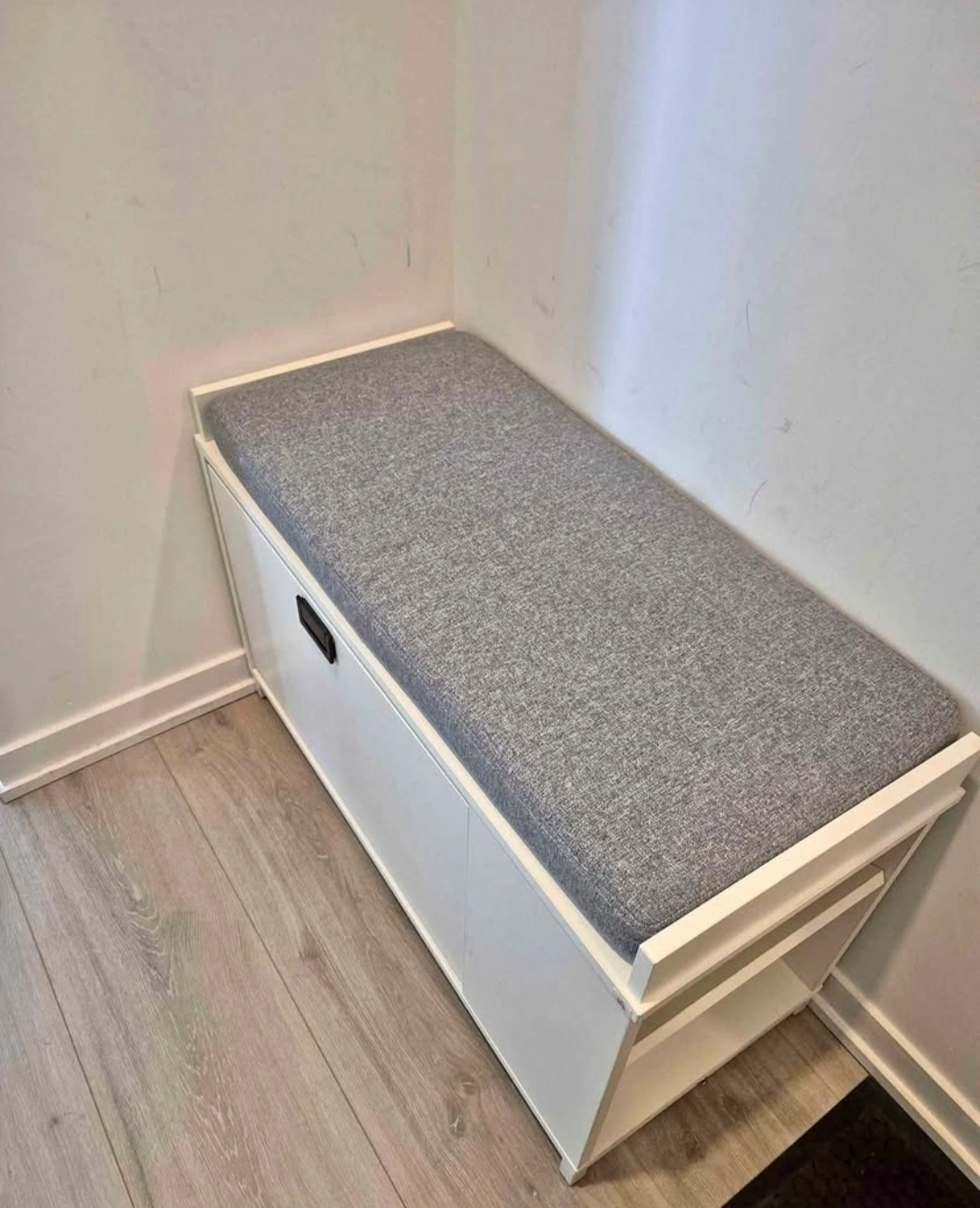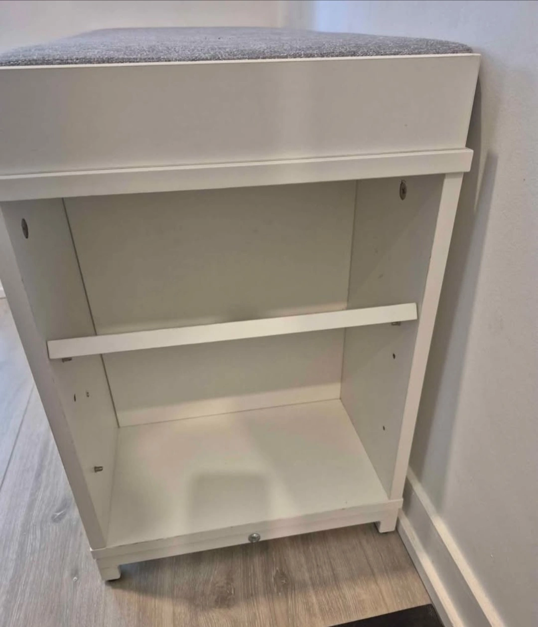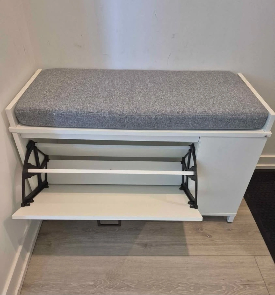 Selling a shoe bench with a comfy cushioned seat! It's perfect for keeping your entryway organized and providing a spot to sit while you put on your shoes. The bench is white with a grey cushion. It's in great condition and ready for a new home!
