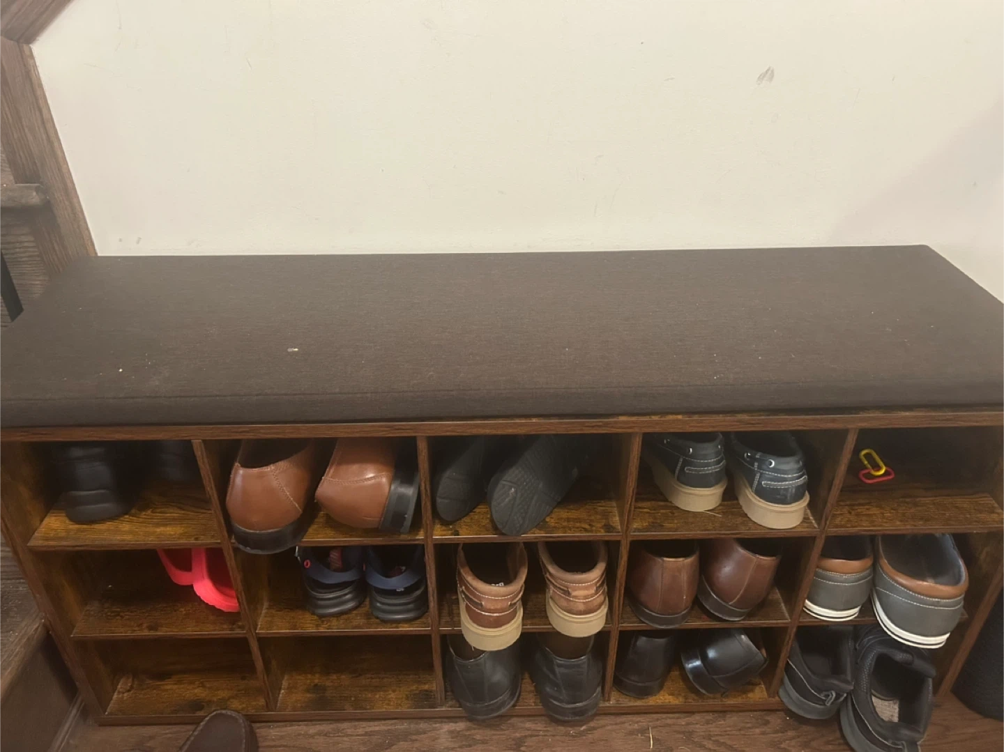 Selling a shoe rack bench with a cushioned top. It's great for organizing shoes and providing a comfortable place to sit while putting them on. The bench has multiple compartments for storing different pairs of shoes. It's in good condition and ready for a new home!