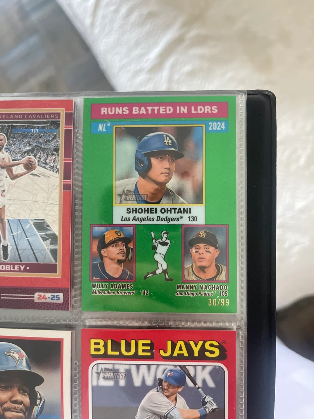 Selling a Shohei Ohtani Los Angeles Dodgers trading card from the Topps Heritage series. It's part of the 'Runs Batted In LDRS' collection for 2024. Also features Willy Adames and Manny Machado!