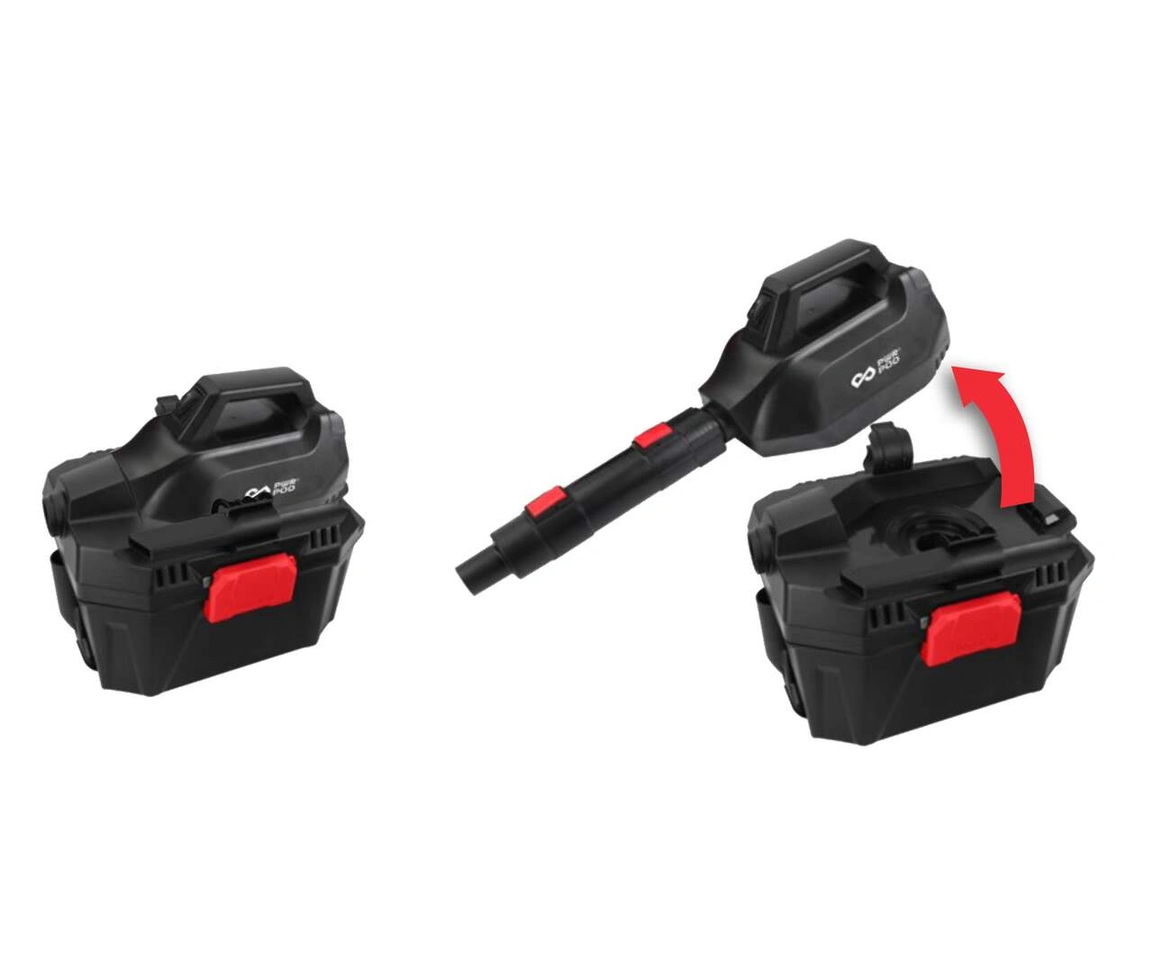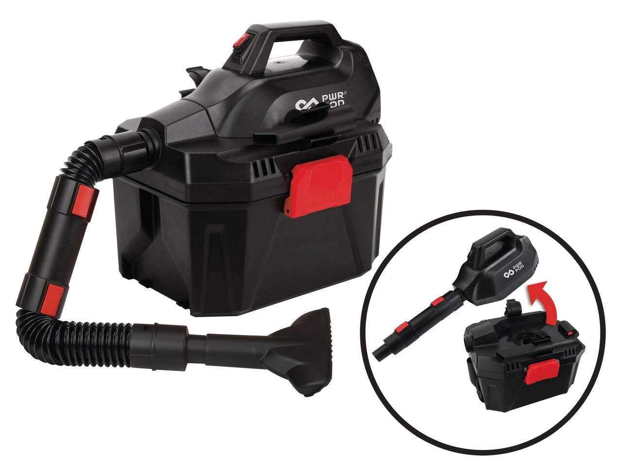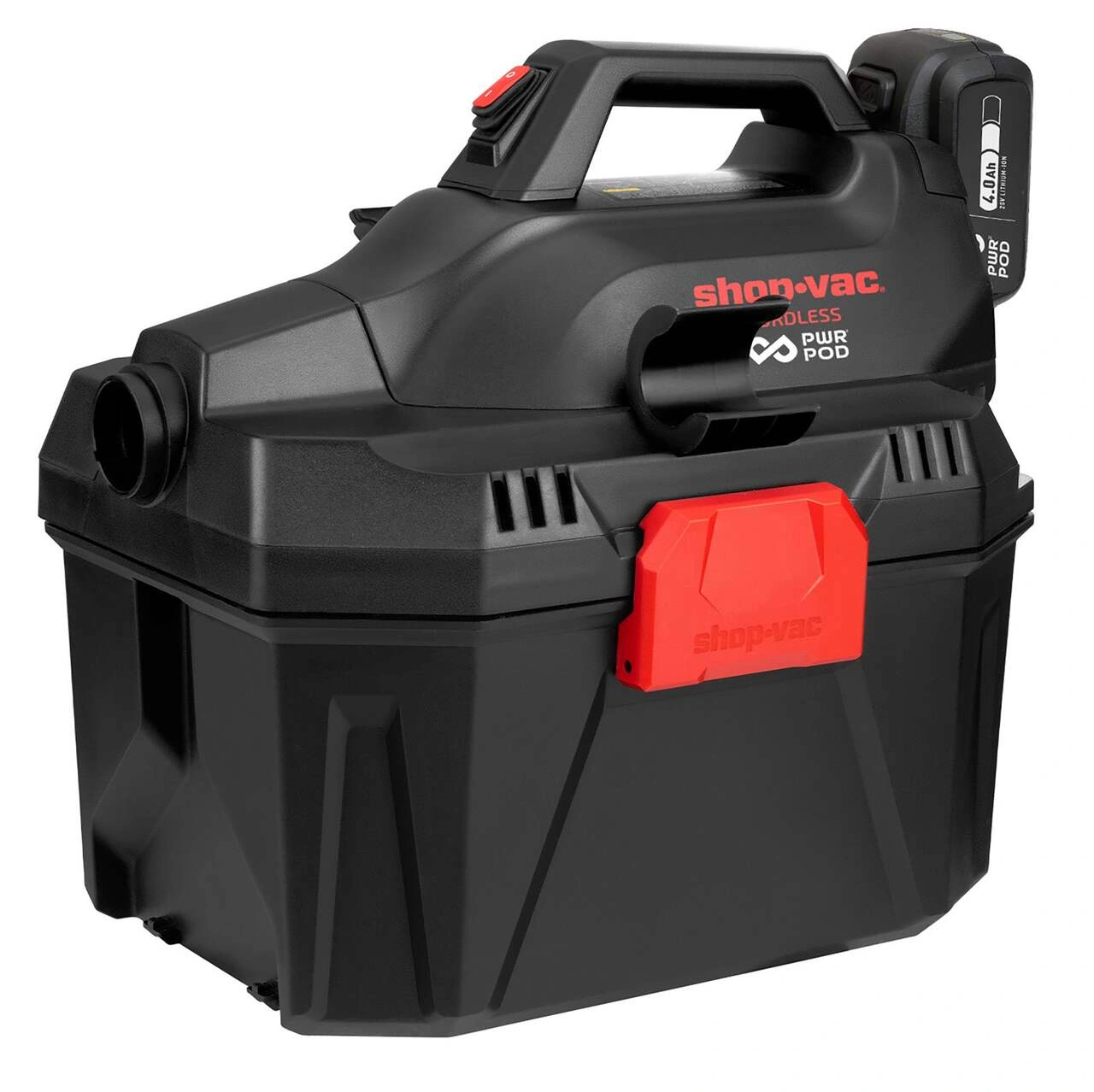 Product Details The Shop-Vac 20V Wet/Dry Vacuum is a cordless 2-in-1 vacuum and blower with a 2-gallon capacity. It works with the PWR POD 20V battery system (sold separately) and includes a detachable blower, dust filter, gulper nozzle, crevice tool, and foam sleeve. It has an extendable hose, tool storage, and fits 1/4-in accessories, with 45 CFM airflow. With all of its included accessories, this vacuum is practical for both quick cleanups and detailed tasks. Features A 2-in-1 cordless wet/dry vac with detachable blower Operate only with PWRPOD universal 20V MAX battery system (battery sold separately) Comes with a handy detachable blower unit, a high-efficiency fine dust blue filter, a gulper nozzle, a crevice tool, and a foam sleeve Incorporated extendable hose 0.7-3.6' (.21-1.1 m) Features locking hose feature and convenient tool storage Capacity: 2 US Gal (7.5 L) Compact and lightweight design for easy portability and maneuverability Ideal for both wet and dry cleaning tasks with its versatile functionality