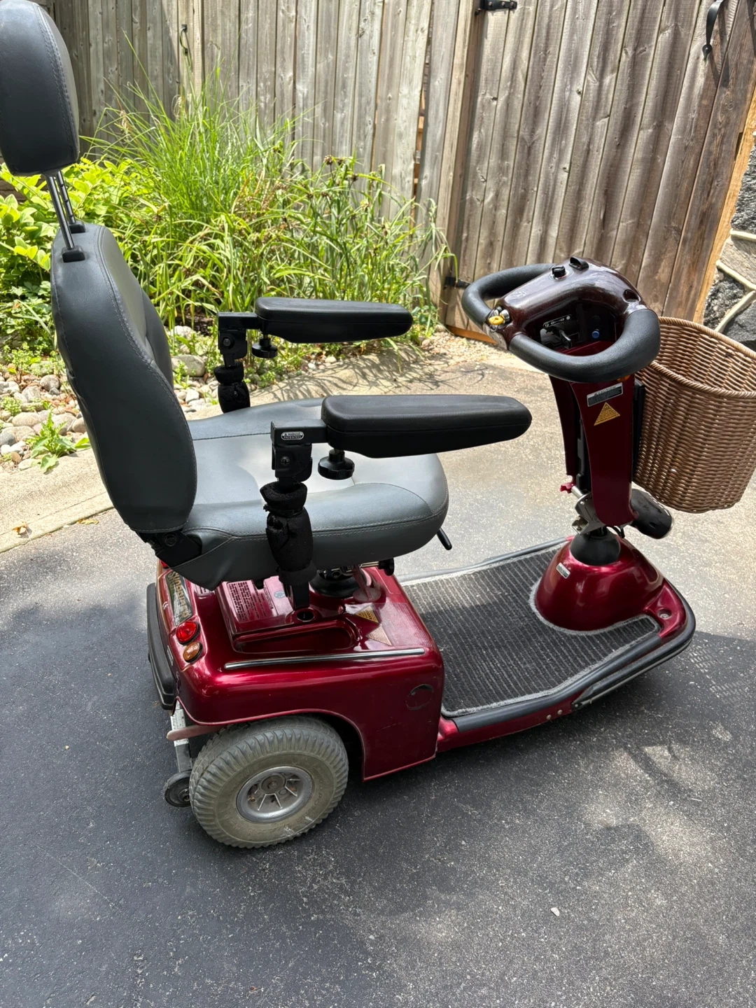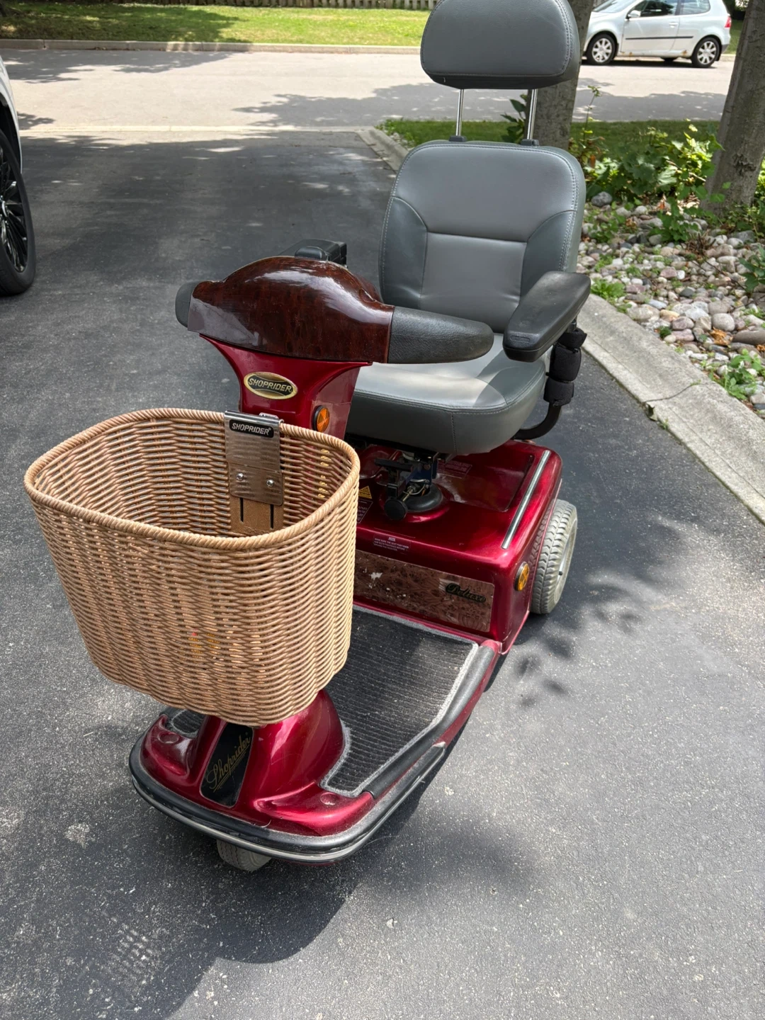 Selling a burgundy Shoprider mobility scooter. It comes with a comfortable seat, armrests, and a basket for carrying items. Great for getting around!