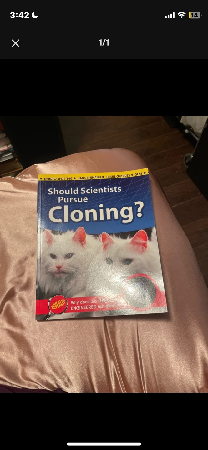 Selling a book titled 'Should Scientists Pursue Cloning?' It covers topics like embryo splitting, Hans Spemann, and tissue cultures