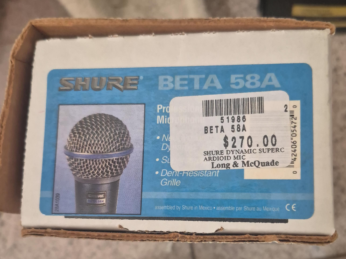 Selling a Shure Beta 58A professional microphone. It's in excellent condition and comes in the original box! The box shows that it was originally bought for $270 at Long & McQuade. Features a dent-resistant grille and supercardioid dynamic design
