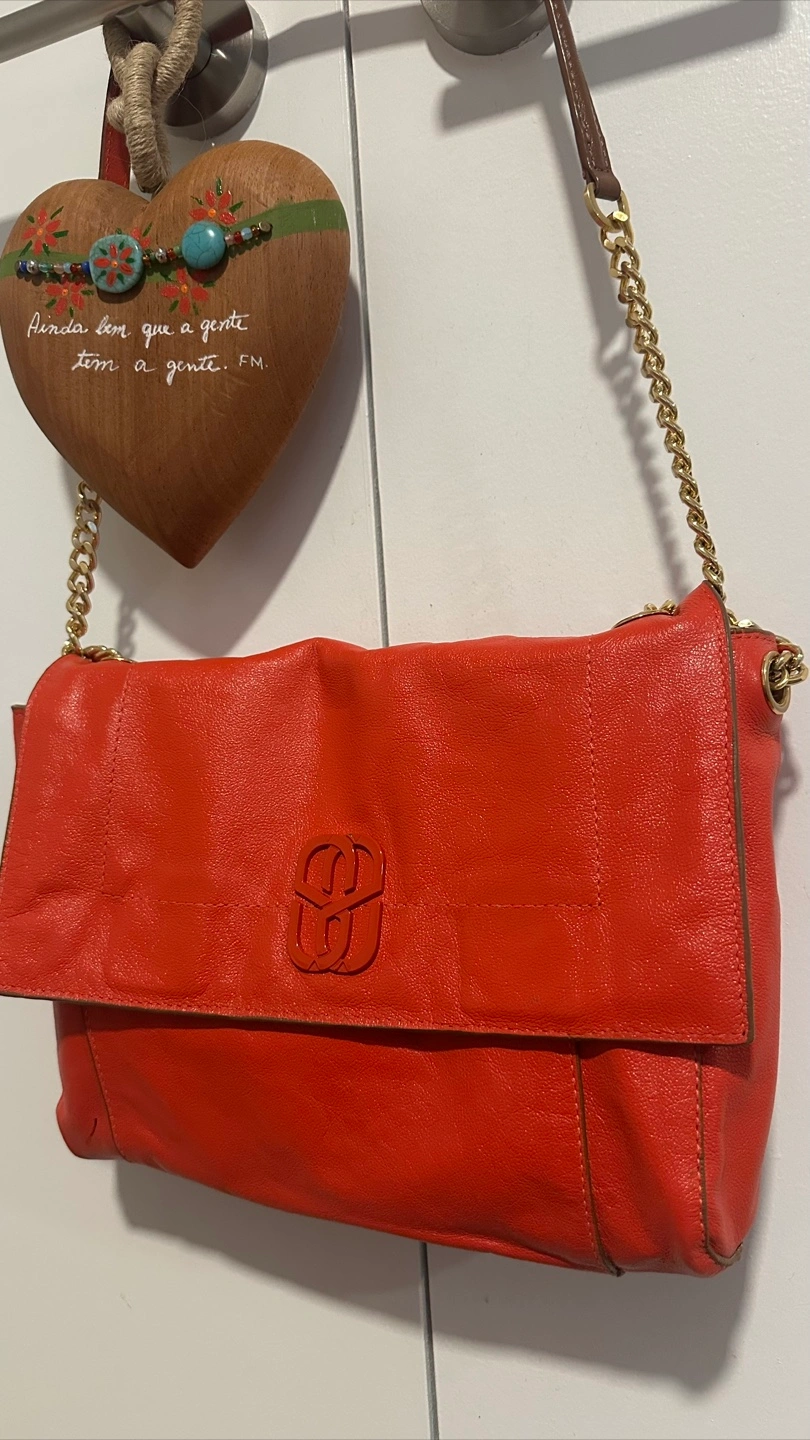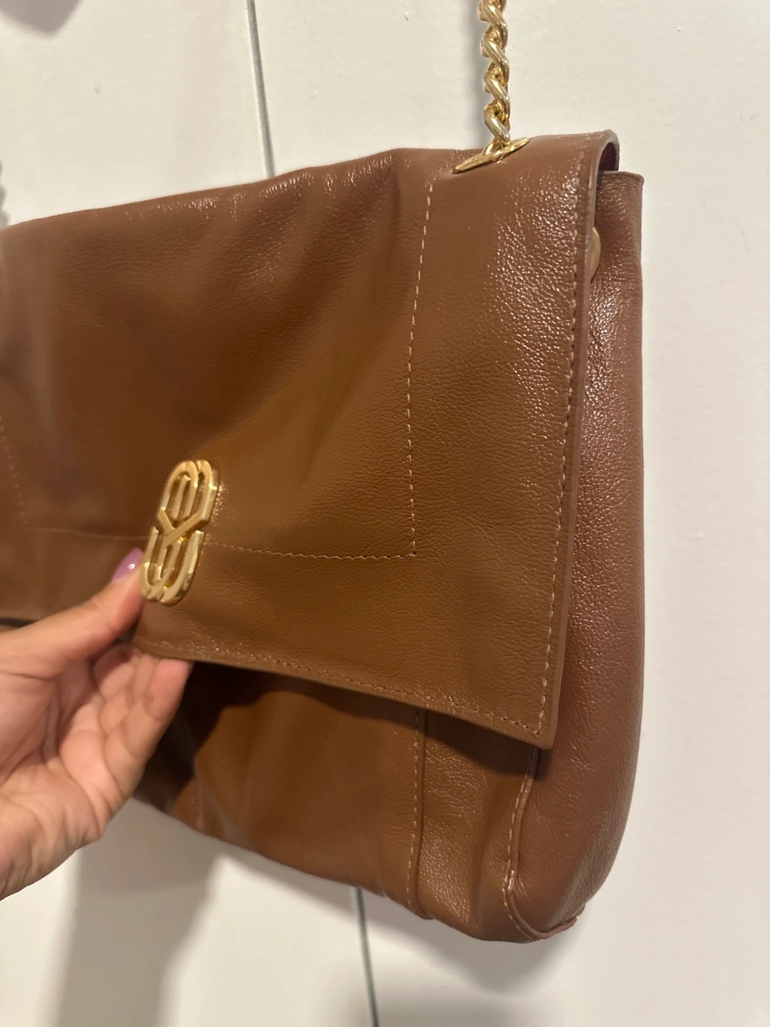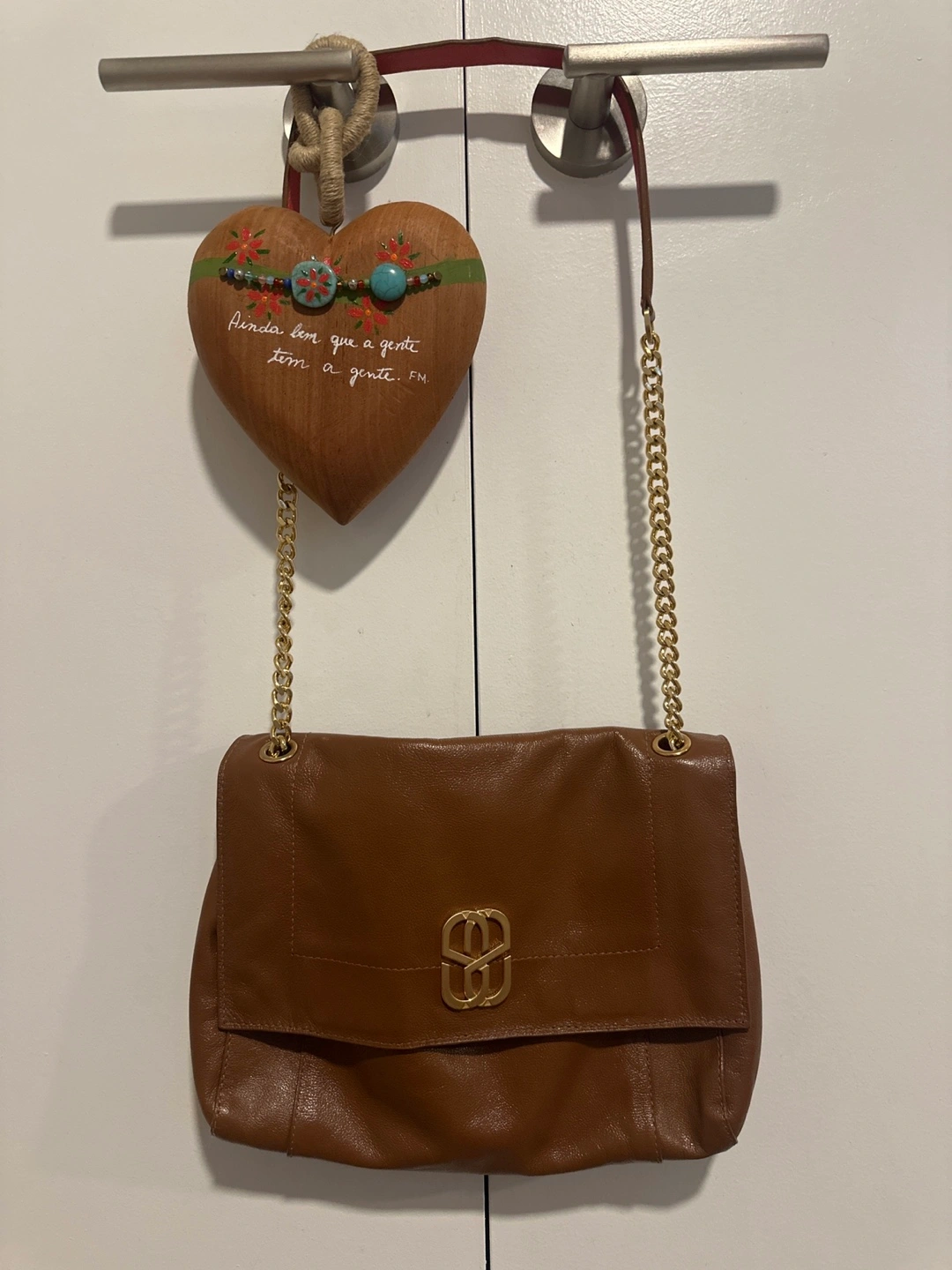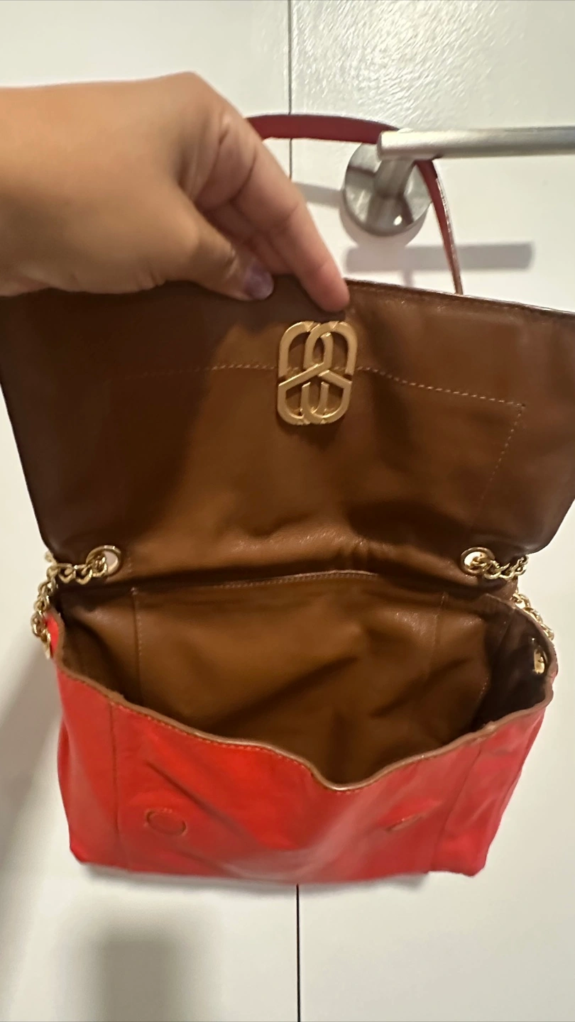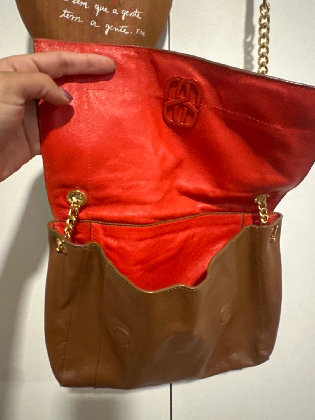 This is a stylish shoulder bag with a gold chain strap. It's made of leather and features a unique logo on the front. The exterior is a beautiful shade of brown, while the interior is a vibrant red. It's in great condition and ready for a new home! It can be used both sides, and it can be also used as a clutch, the chair is removable. Used a couple of times.