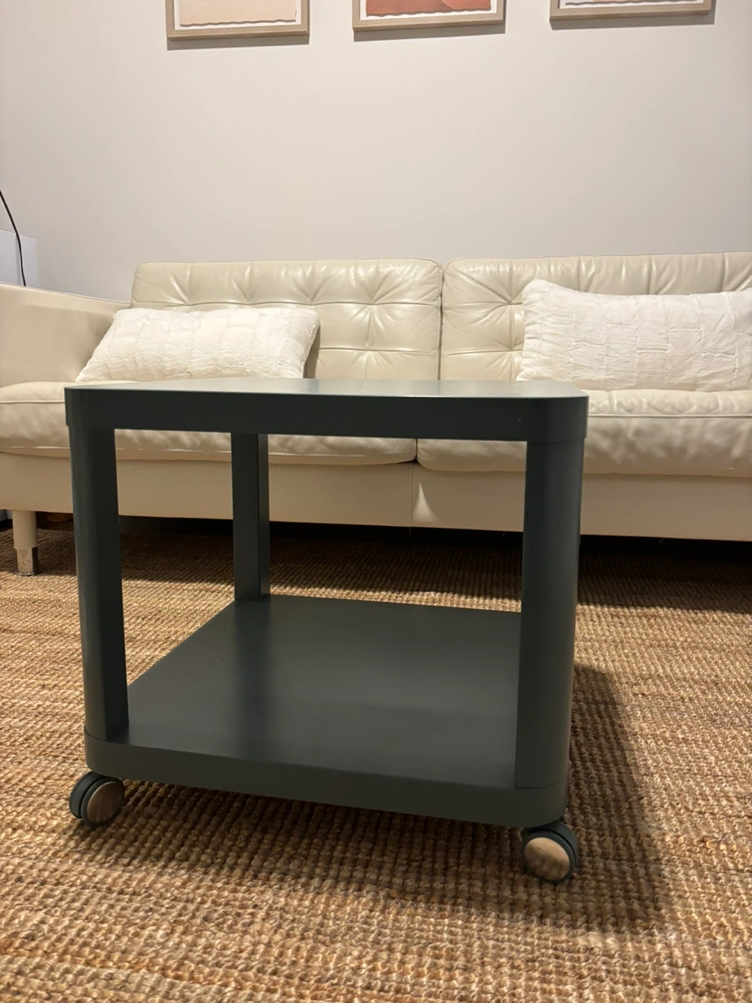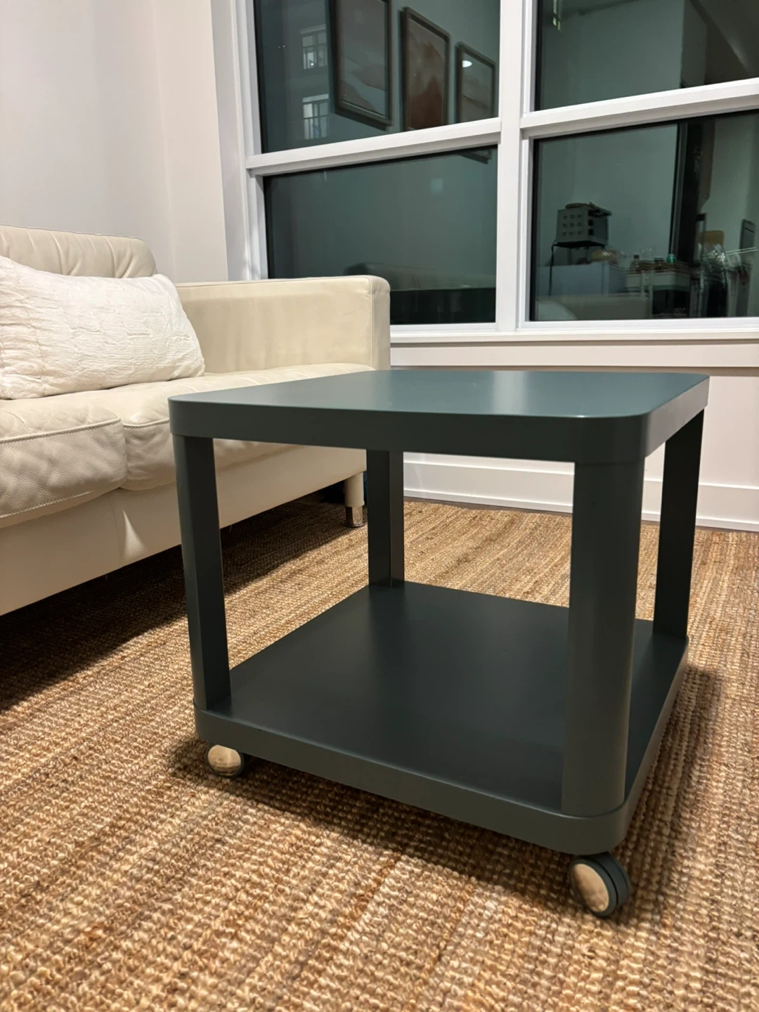 Selling a Side table on casters in shale blue. It's in great shape and ready for a new home! This stylish table features a sleek design and a convenient lower shelf for storage. Perfect for adding a touch of modern flair to your living space