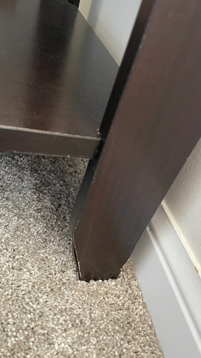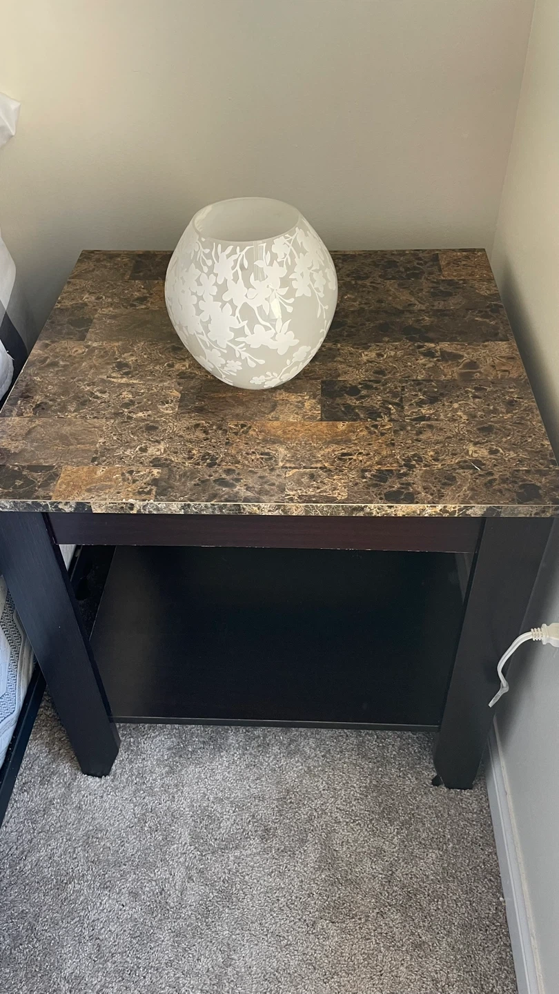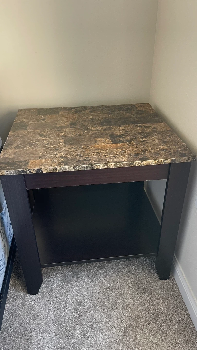 Side table with a faux marble top and a dark brown frame. It has a shelf for extra storage. There are some signs of wear on the legs, as shown in the photos, but overall it's in good condition and very sturdy