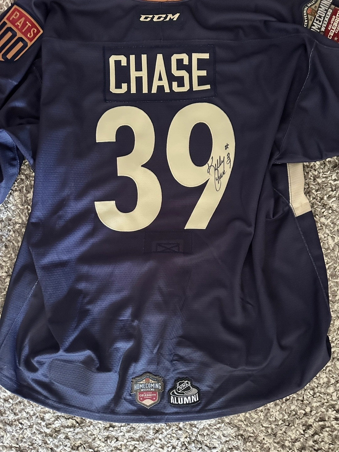 Selling a CCM hockey jersey featuring the Pats Alumni design. It's in great shape and ready for a new home. The jersey has the number 39 and the name CHASE on the back, along with various patches including 'Centennial Salute' and 'Homecoming Weekend'. Perfect for any hockey fan or collector!
