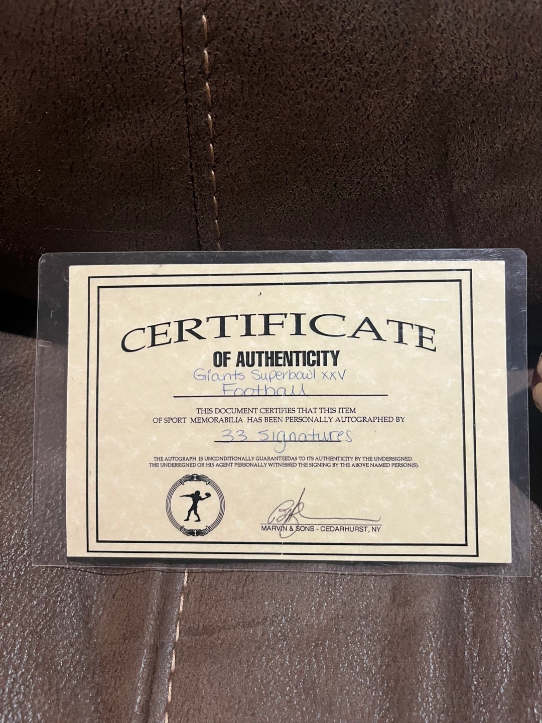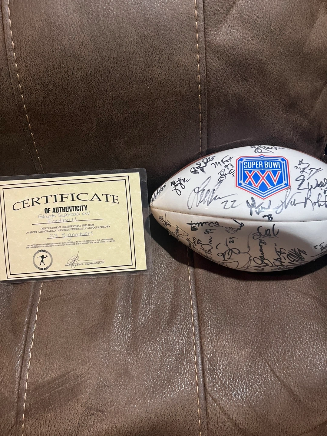 Selling a football signed by members of Super Bowl XXV. It comes with a certificate of authenticity, stating that the football has 33 signatures. A great piece for any sports memorabilia collector!