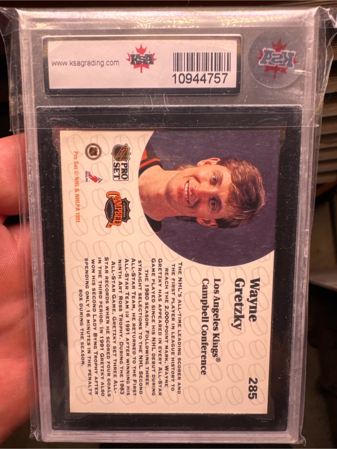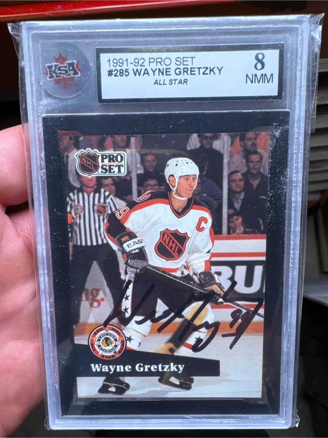 Up for grabs is a signed Wayne Gretzky 1991-92 Pro Set All Star card, graded NMM 8 by KSA grading! A must-have for any hockey fan or card collector