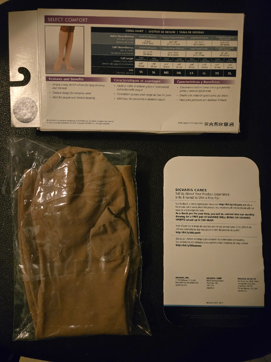 Selling a pair of Sigvaris Select Comfort knee-high compression socks in size XS 20-30mmHg! These are designed for everyday wear and offer a unique 2-way stretch for easy donning and removal. They're ideal for people with limited dexterity. The open box and original packaging/insert is included! I got these from another Karroter and only realised once I pulled them out to try on that the XS on the box is not Extra Small (which would be my size) but XL (Extra Large) Short. Be sure to check the sizing chart. Product info: https://www.amazon.ca/SIGVARIS-Womens-Select-Comfort-20-30mmHg/dp/B06XCWX14V/