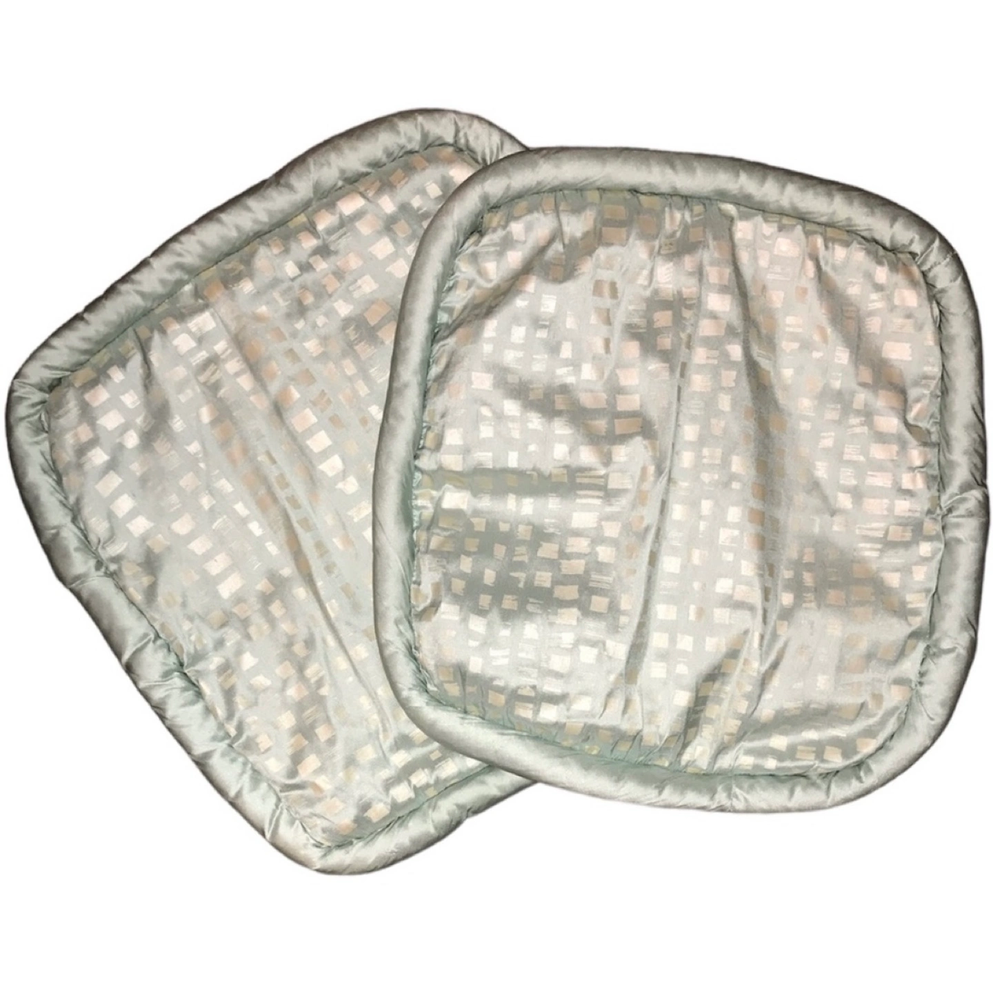 These gorgeous custom-made cushion shams will add elegance to your bed or couch. Zipper closure. Excellent condition. Dimensions: 17.5" x 17.5" (inside), 19.5" x 19.5" (outer edge to outer edge) Material: 100% silk Colours: icy sage, silvery To be picked up in the Yonge & Davisville area.