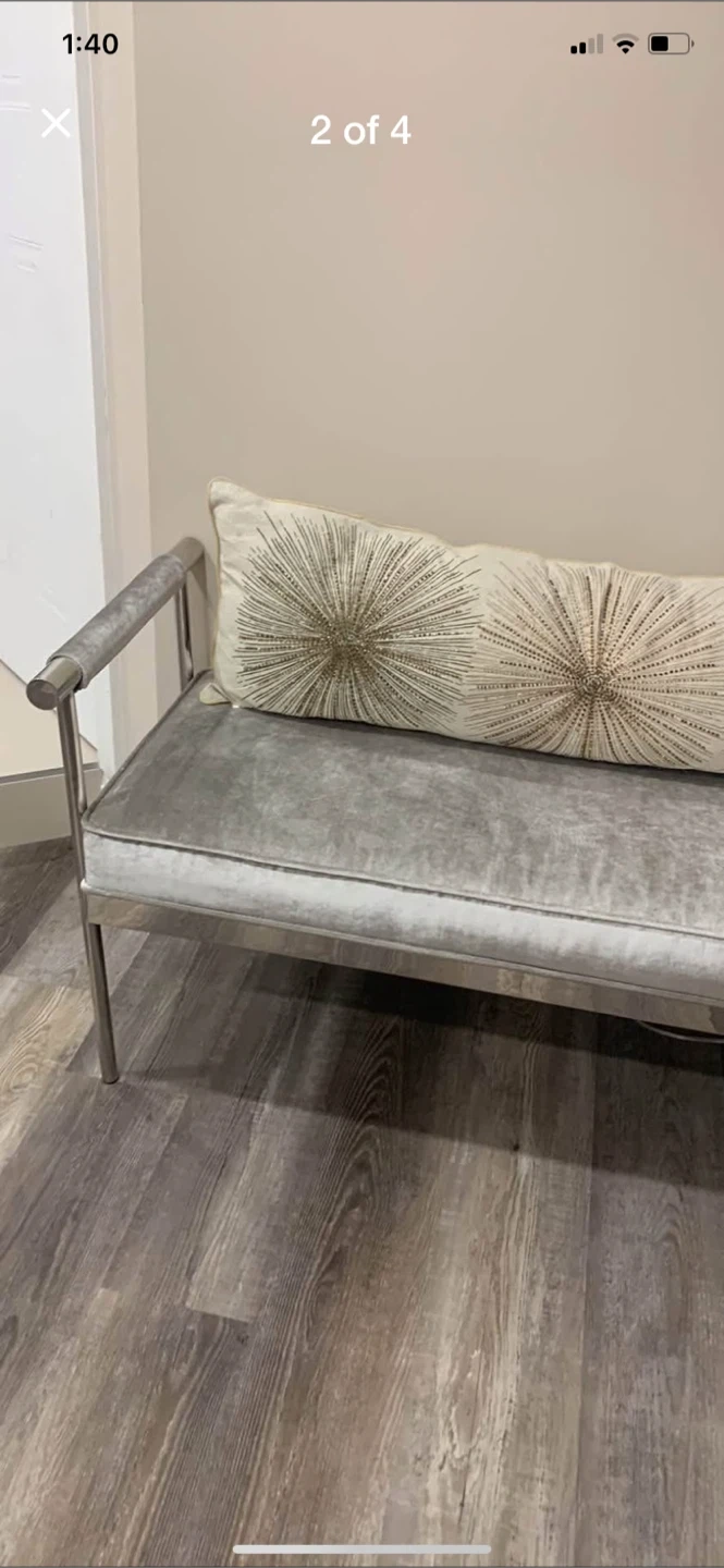 Selling a silver bench with a pillow. It's in great condition and would look great in any entryway or living room. The bench is sturdy and the pillow is comfortable. Perfect for adding a touch of elegance to your home!