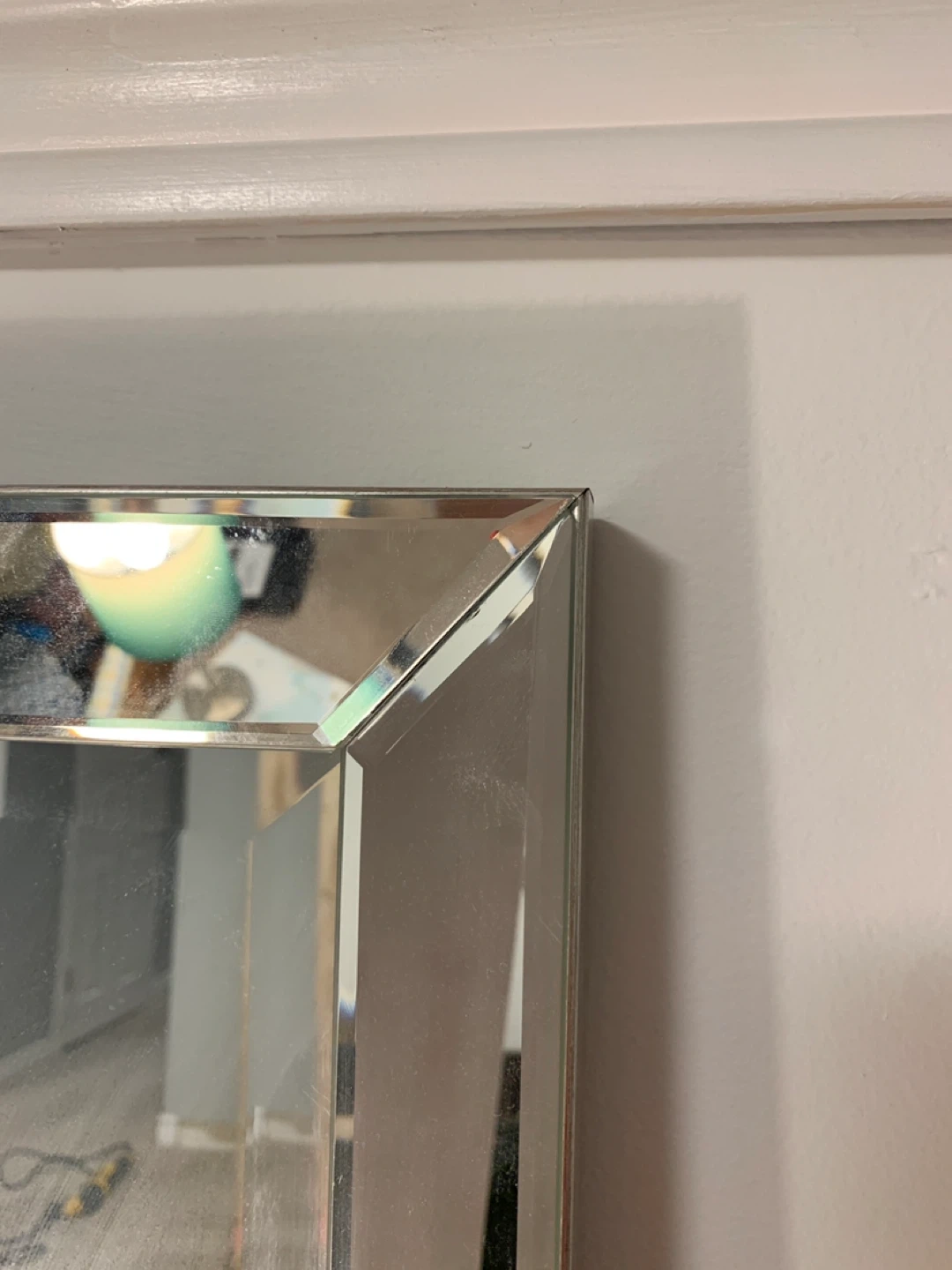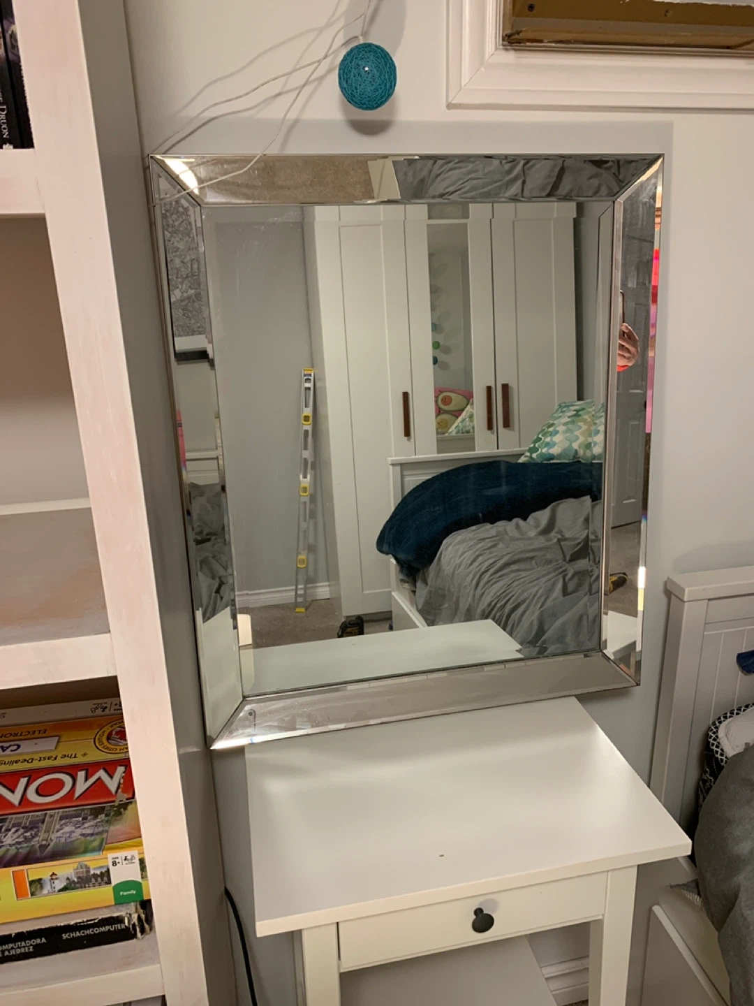 Here's a lovely silver-framed mirror that would look great in any room. It's in good condition and ready to add a touch of elegance to your home