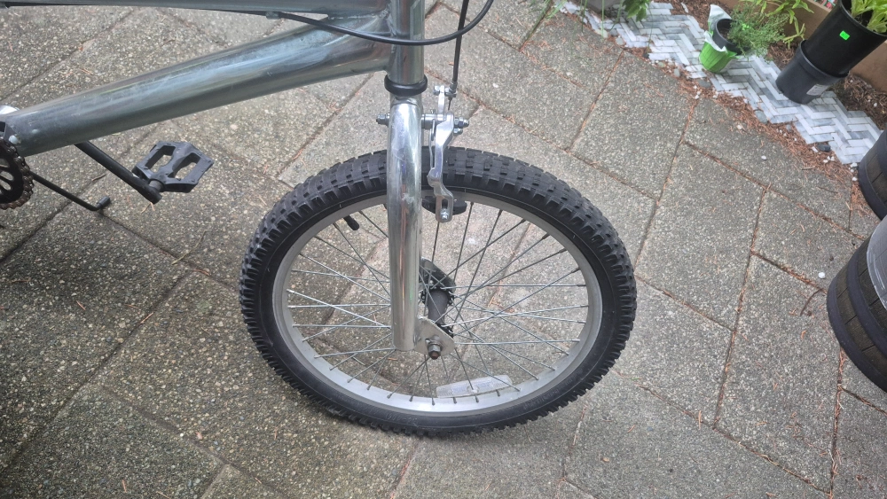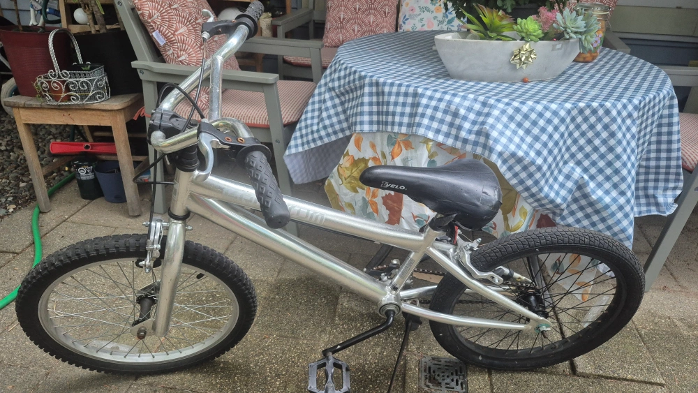 Selling a silver BMX bike. It has a black seat and black tires. Great for kids!