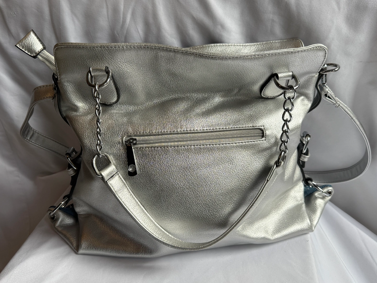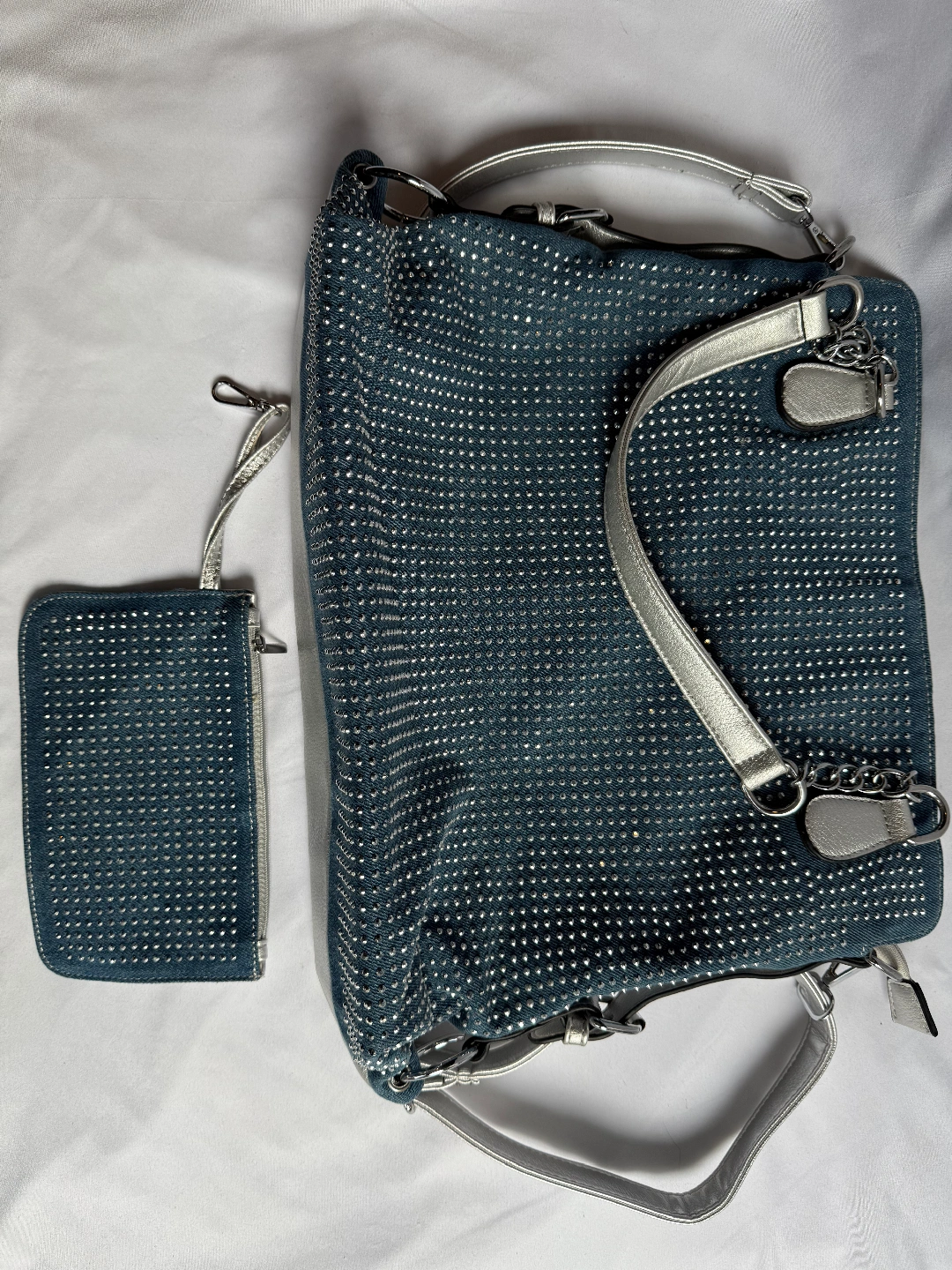 Cute silver and blue shoulder bag with studded detailing! It comes with a matching wallet tote. The bag is in great condition and ready for a new home!