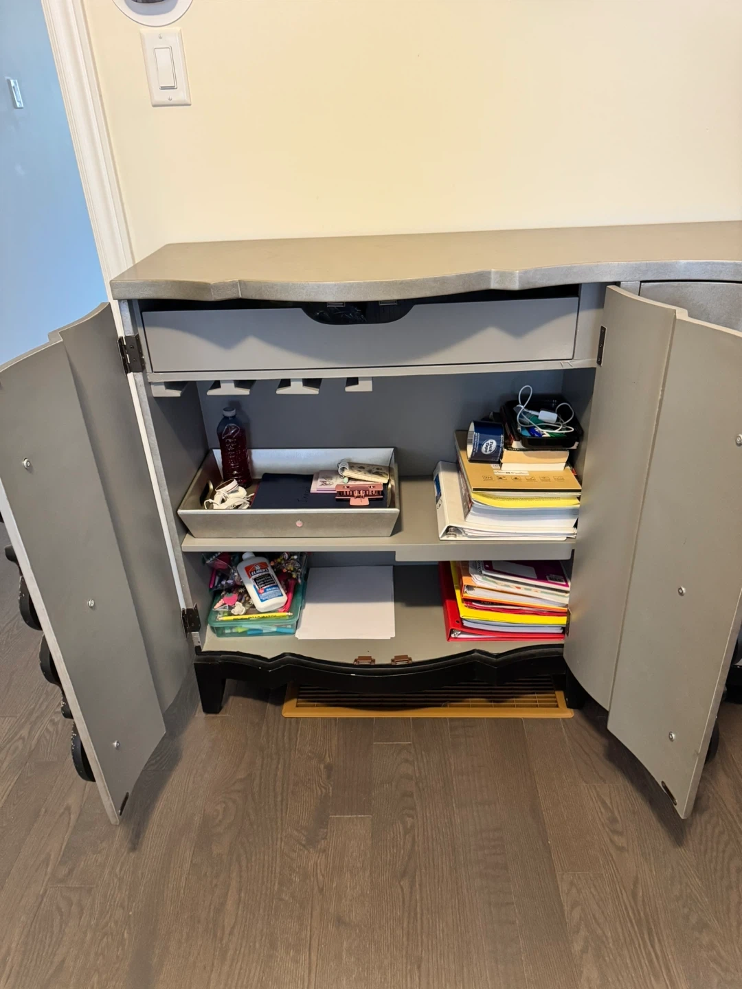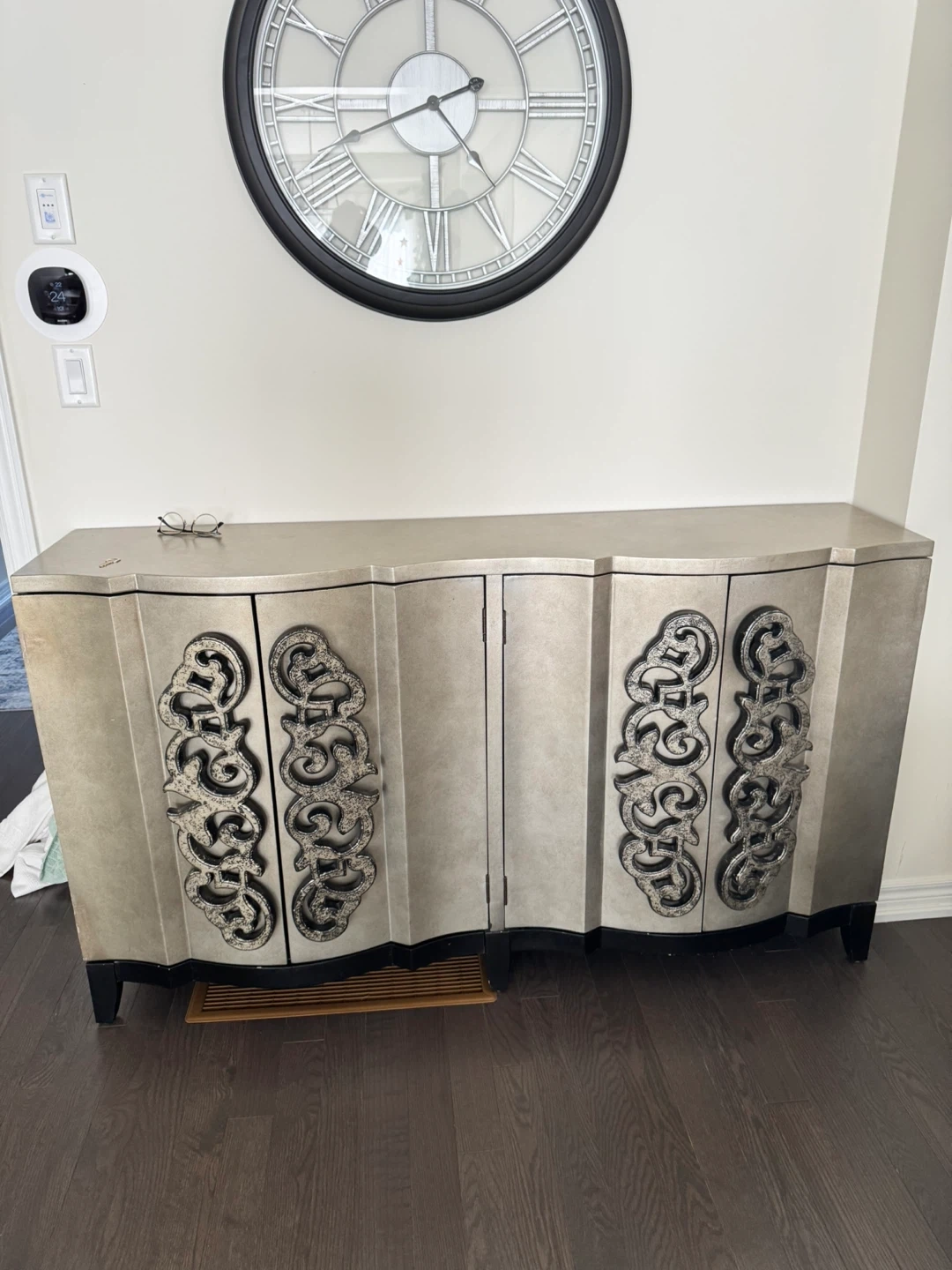 Selling a lovely silver cabinet! It features unique ornate details on the doors, adding a touch of elegance to any room. It offers ample storage space with shelves and a drawer inside. Perfect for organizing your belongings while enhancing your home decor