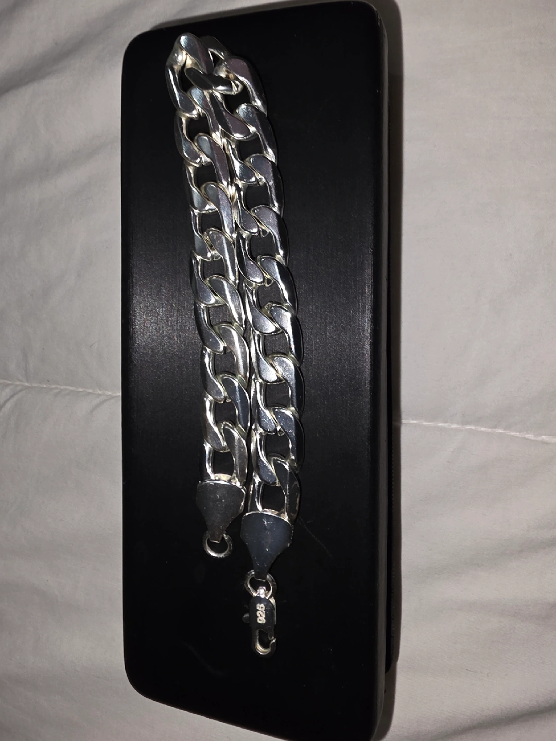 Selling a silver chain bracelet. The clasp is marked with '925', indicating sterling silver. It's in great condition and ready for a new home!