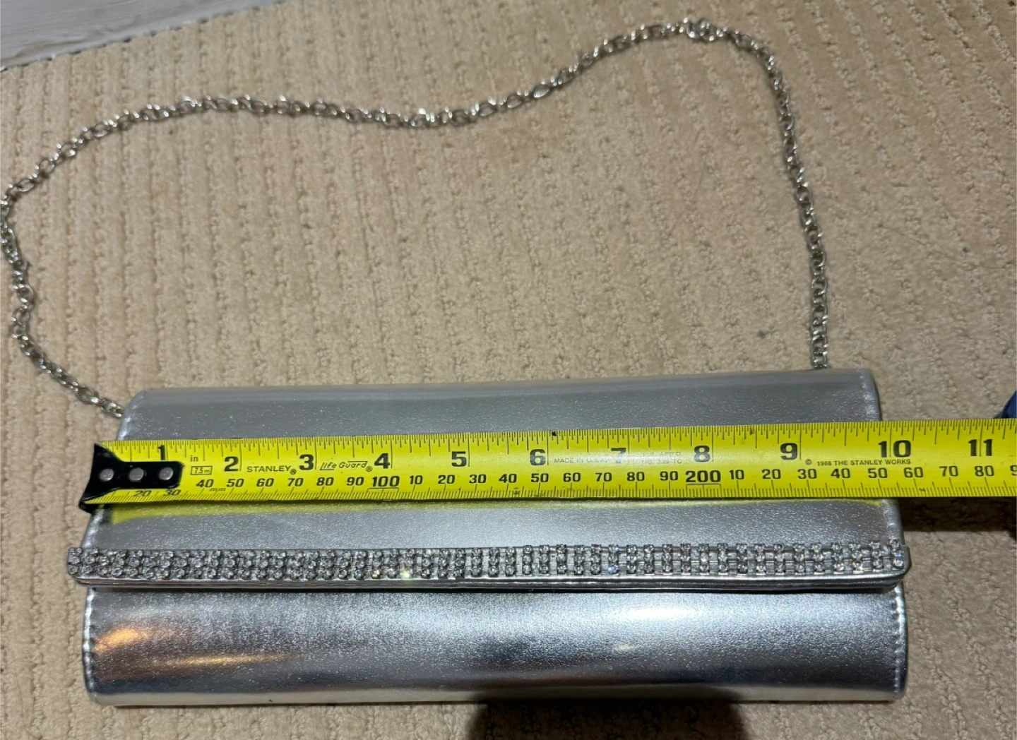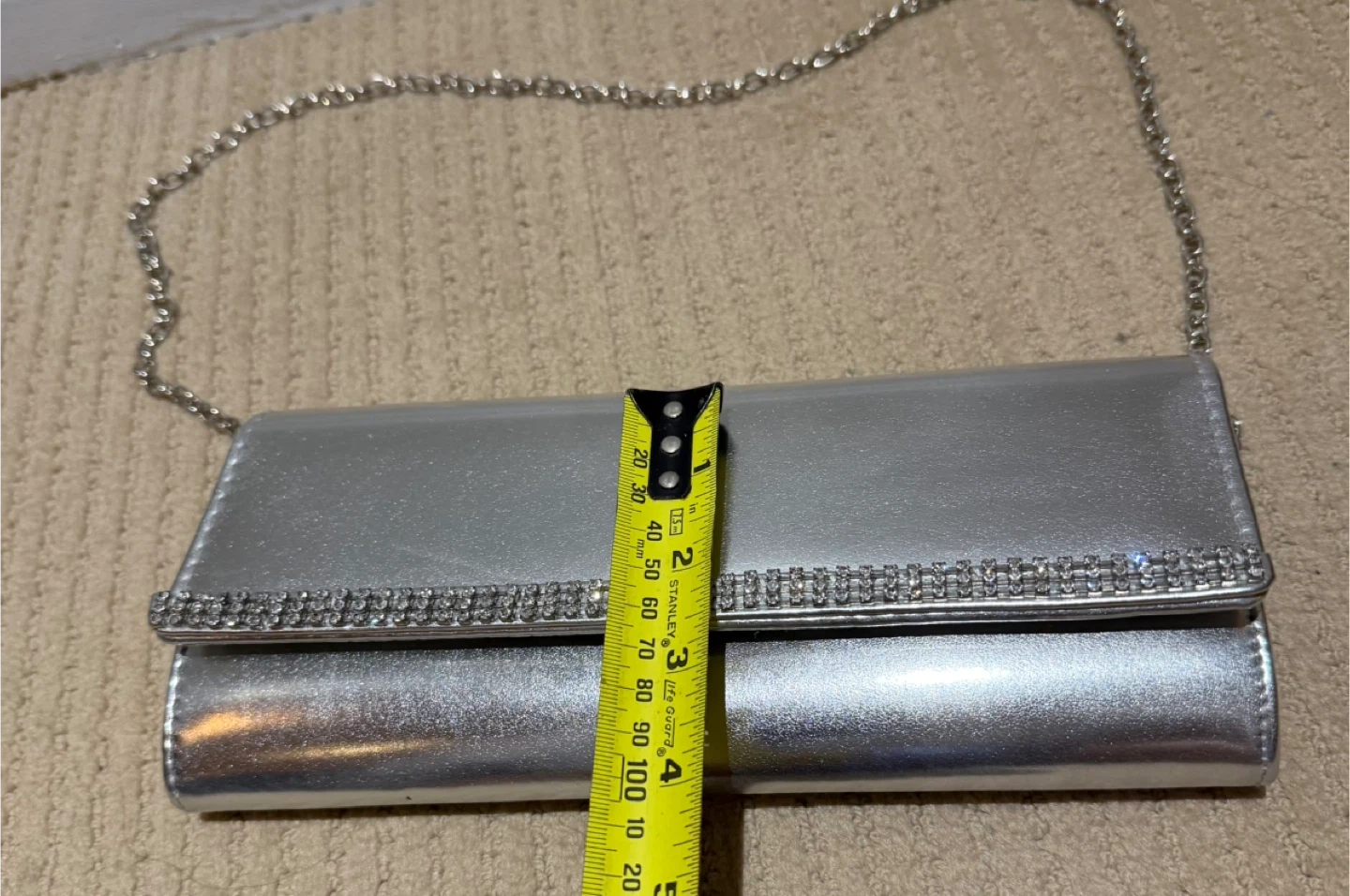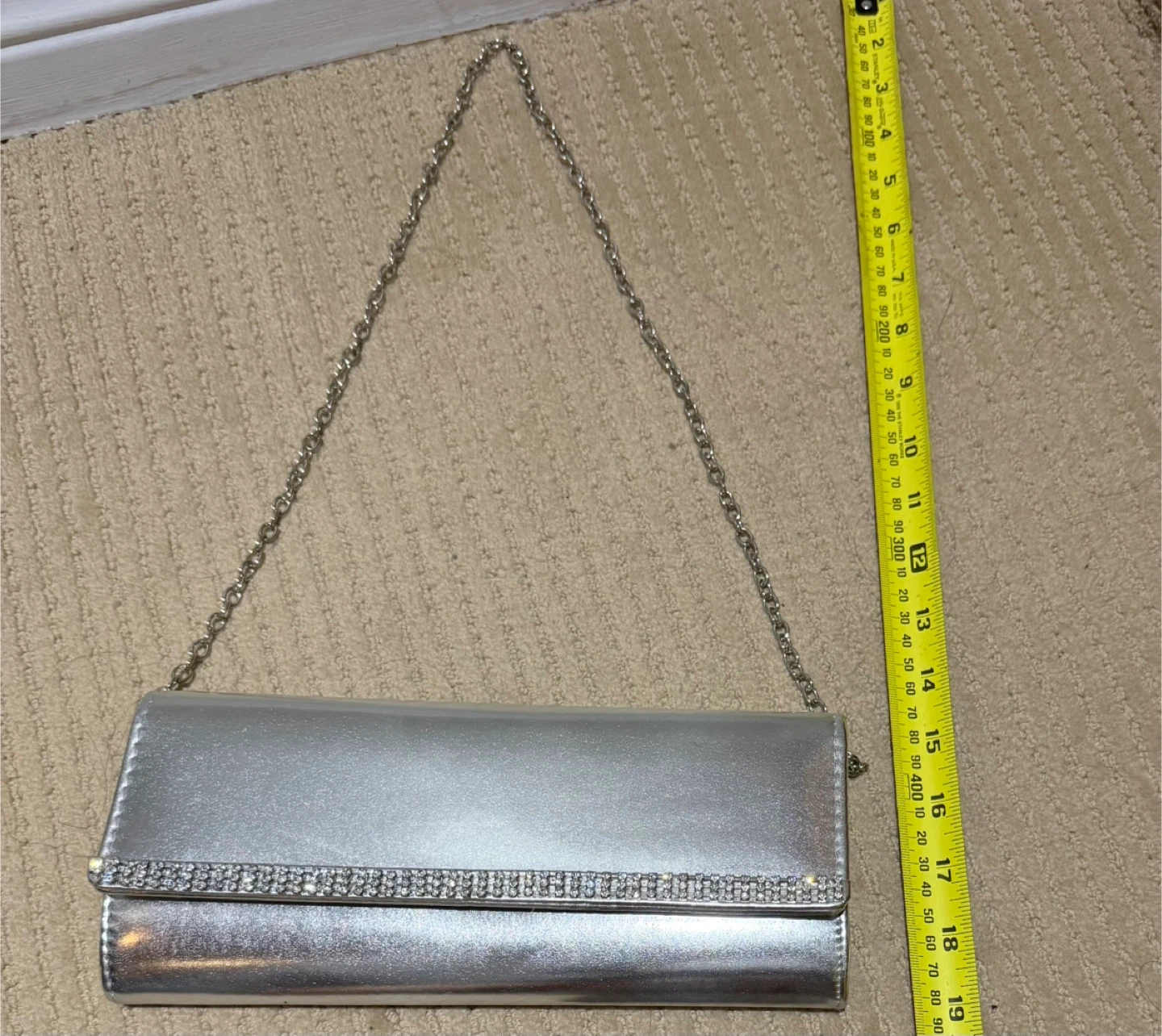 Here's a cute silver clutch with a rhinestone trim! It has a chain, and it is about 9 inches wide and 3 inches tall