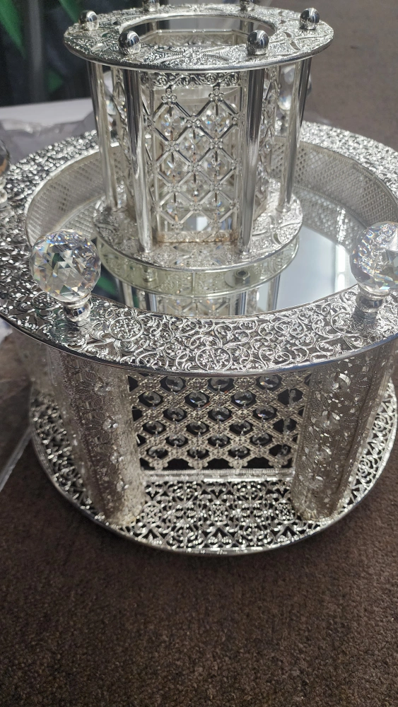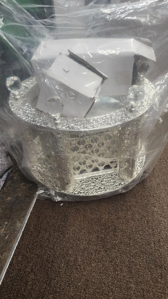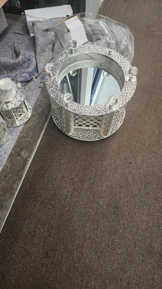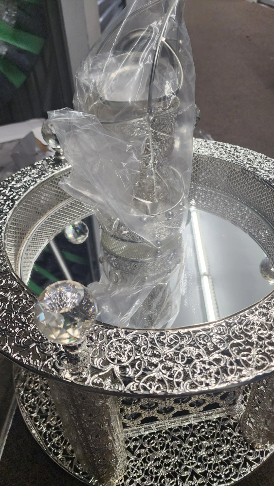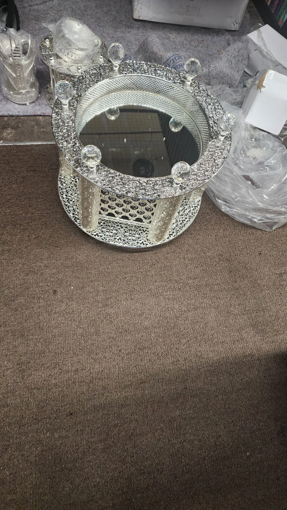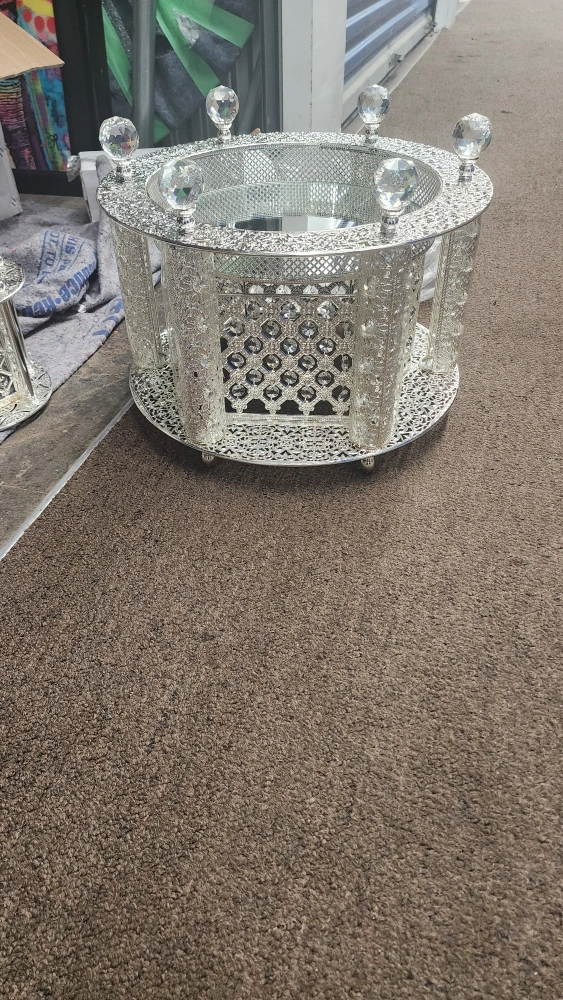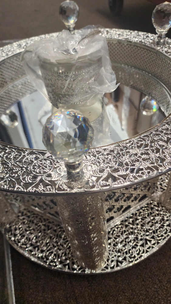 Selling a beautiful silver decorative ! Coffe/Tea table set. features a mirrored top and crystal-like accents. Perfect for adding a touch of elegance to any occasion