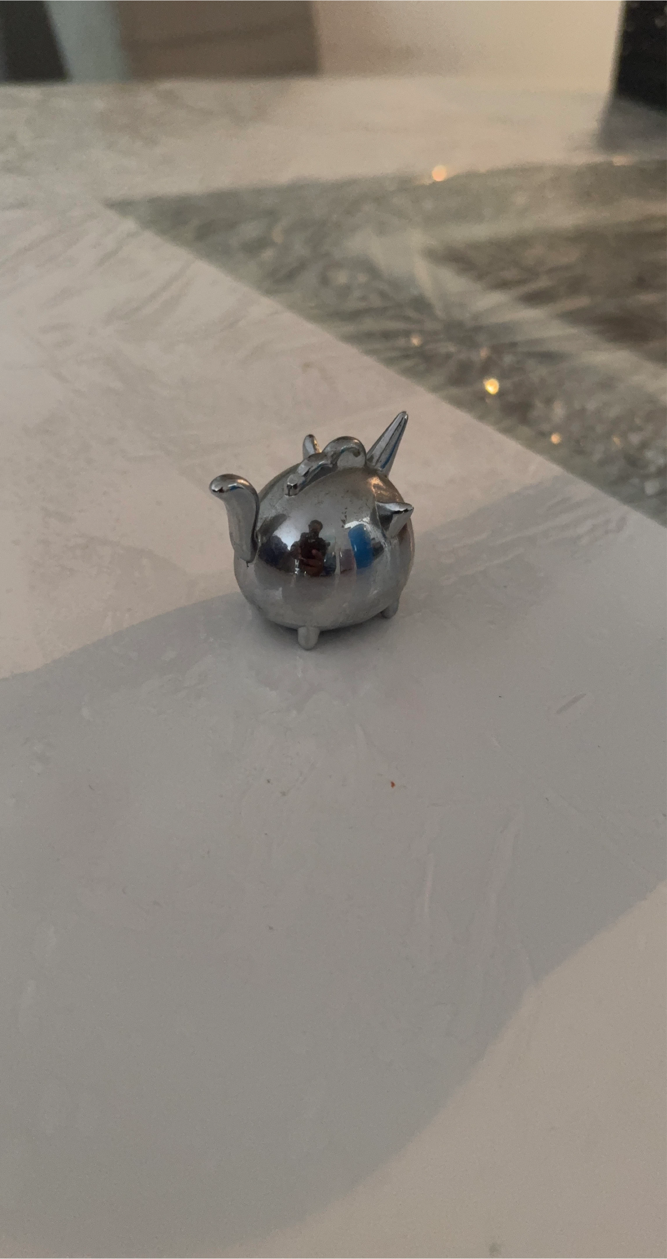 A cute little silver teapot ring holder, perfect for adding a touch of whimsy to your decor! It's in great condition and ready to find a new home