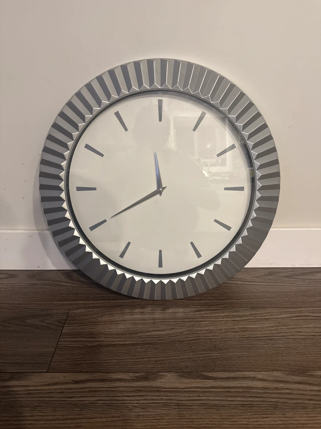 Selling a decorative wall clock with a silver frame! The clock face is white with simple black markers. It would look great in any room!
