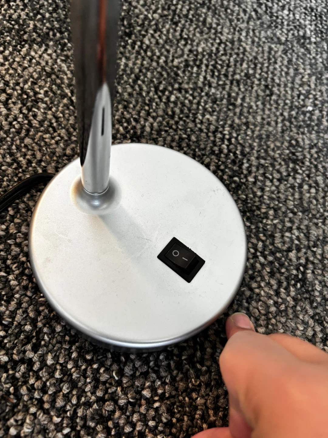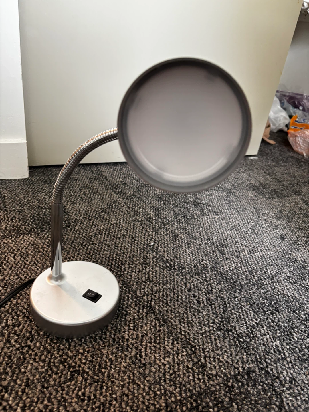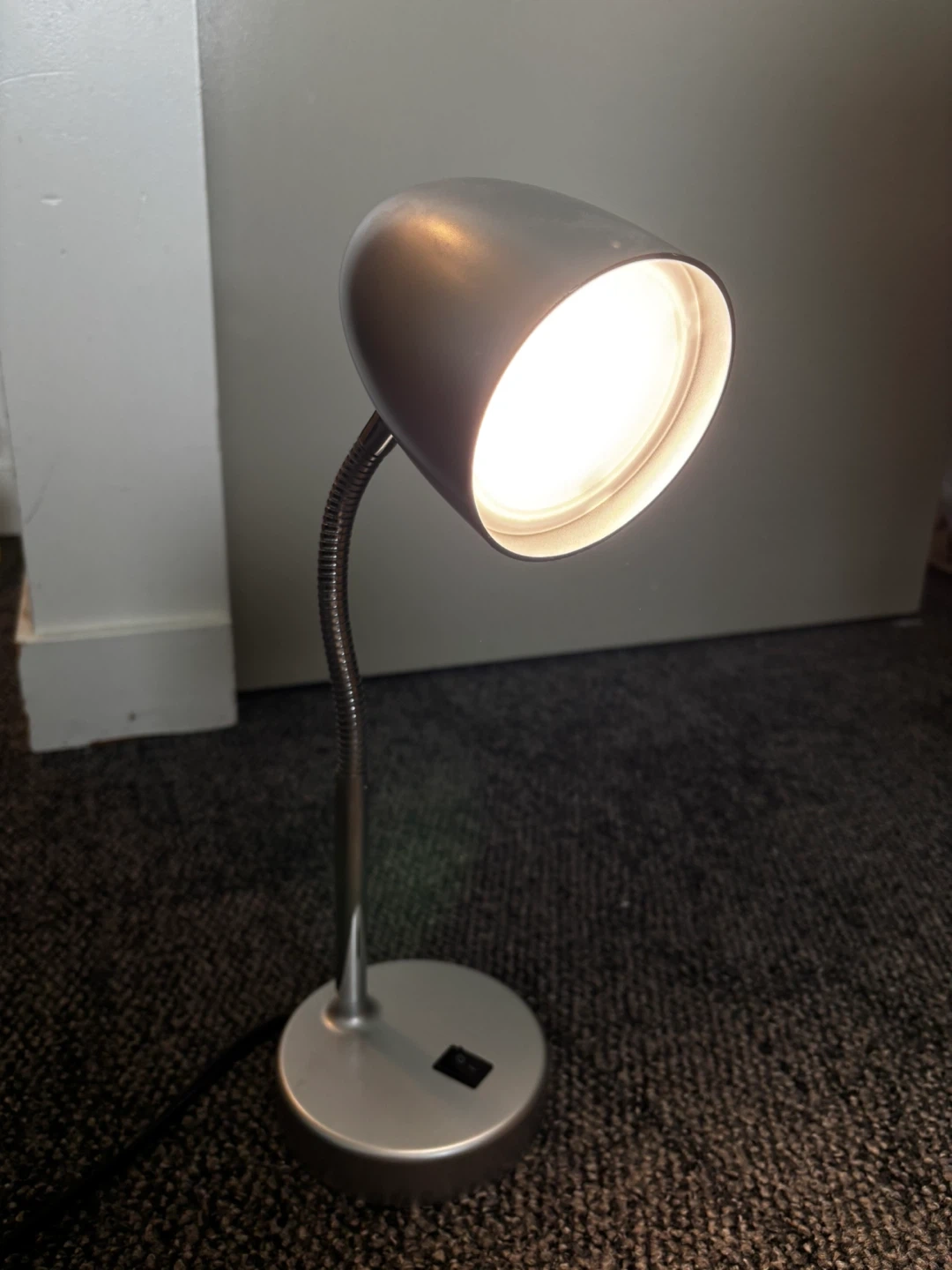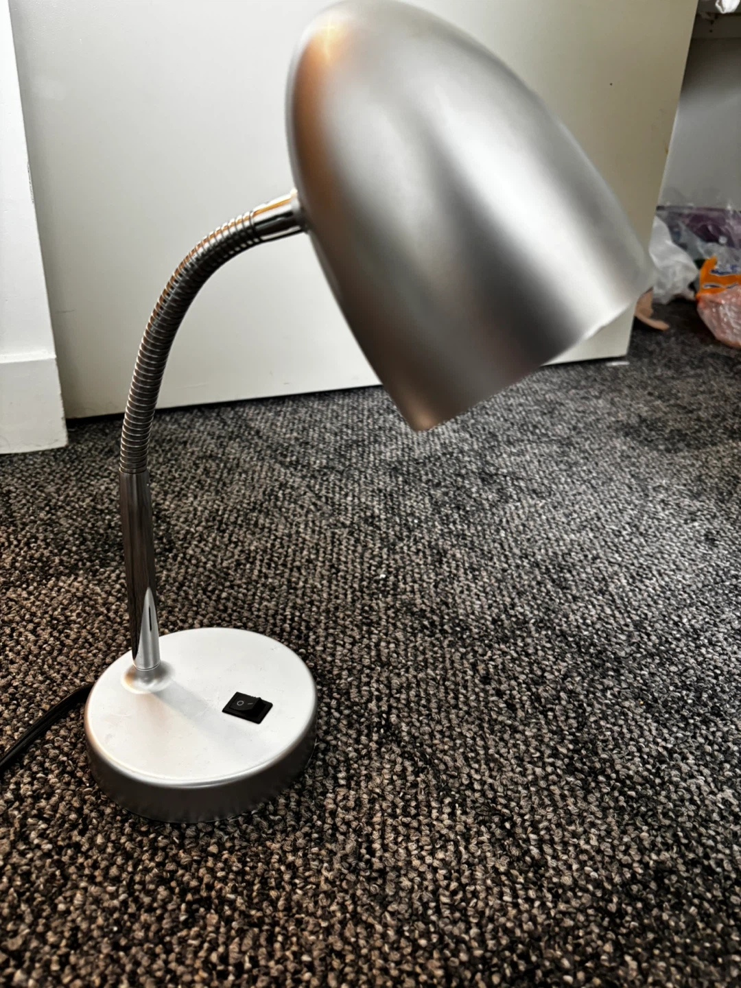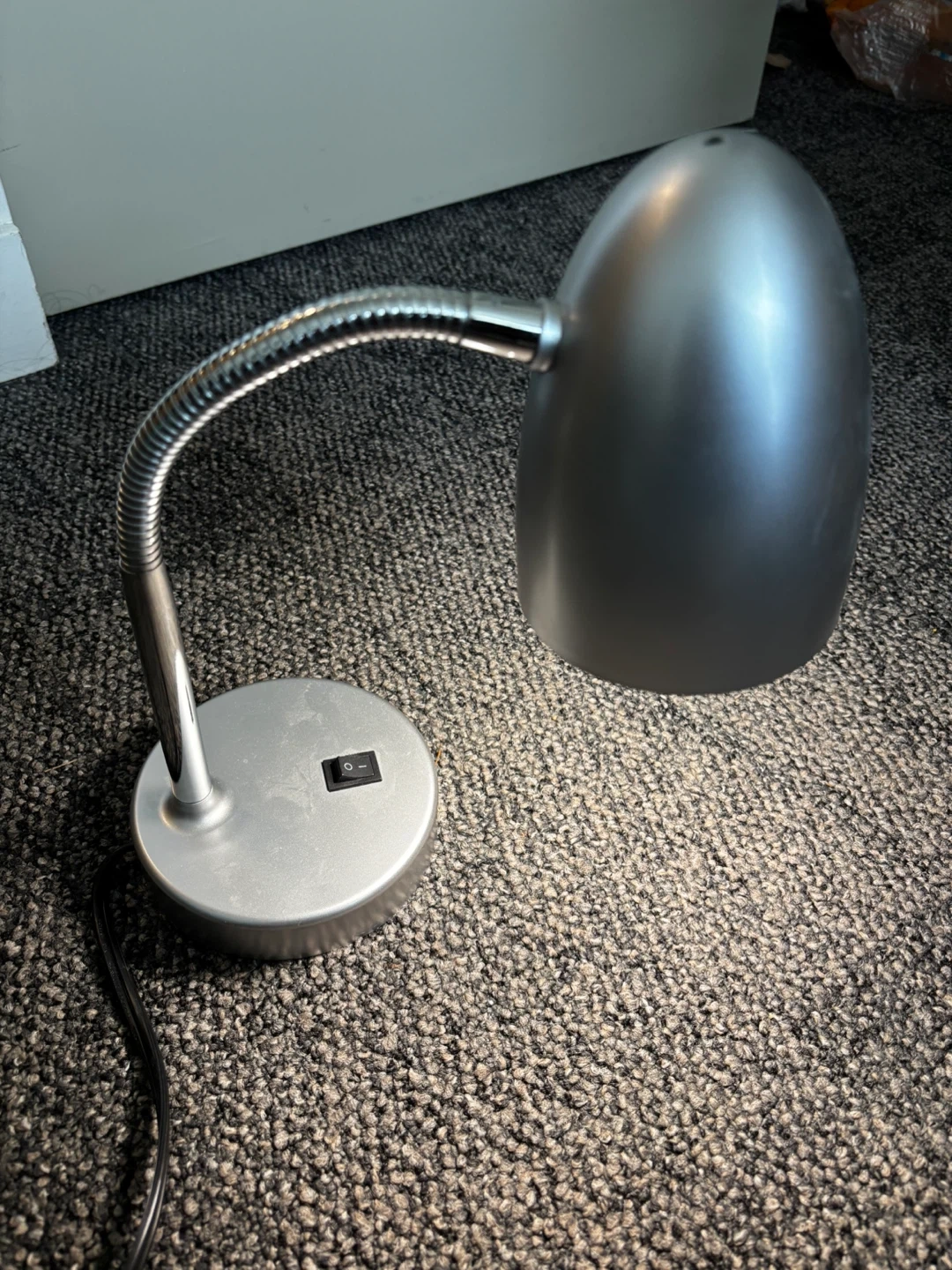 Selling a silver desk lamp in great condition. It features a flexible gooseneck and a simple on/off switch. Perfect for a home office or bedside table!